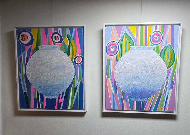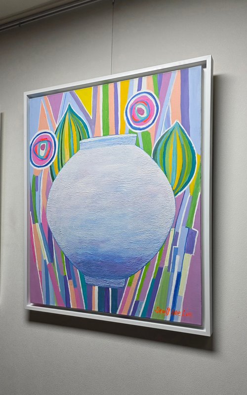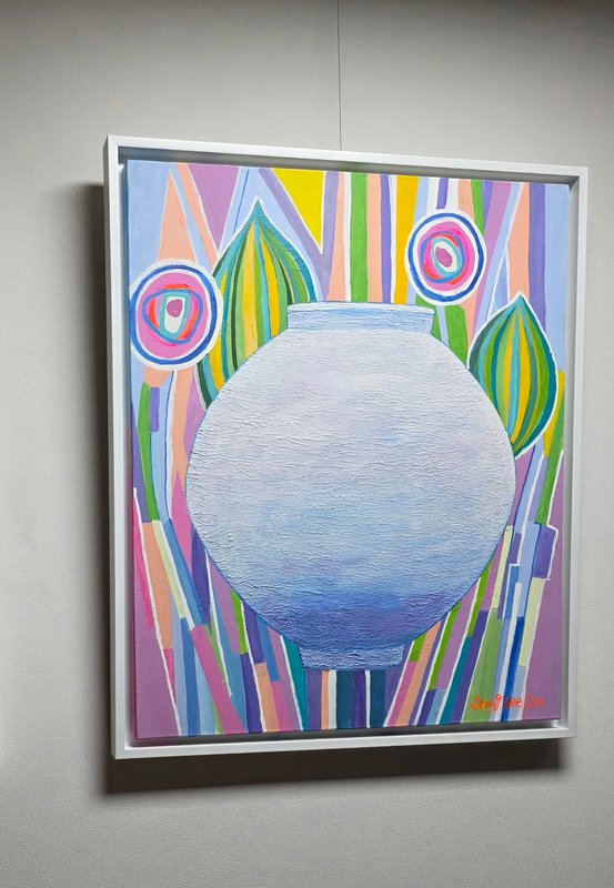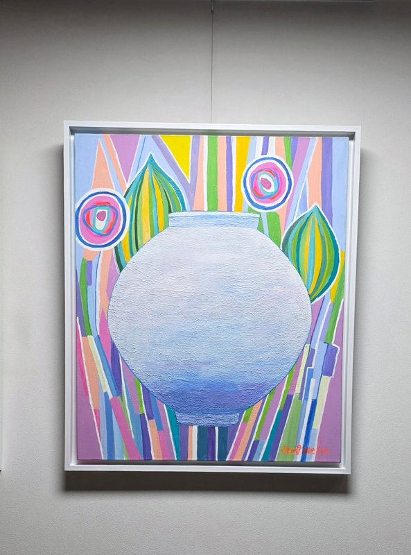 임승희 작가는 꽃과 항아리를 소재로 현대인에게 긍정적인 에너지와 행복감을 주는 작업을 합니다. 작가의 ‘행복 담기’라는 주제로 표현된 달항아리는 황금빛 색채의 두터운 마띠에르가 돋보이며, ‘사랑 이야기’ 시리즈 작품에서는 화려한 색채들이 불꽃이 터지듯 아름답게 물들어 있습니다. 이는 마치 축제의 현장처럼 벅찬 행복감을 느끼게 해주고 감탄을 자아내게 합니다. 작가는 현대인의 상처 입고 닫힌 마음을 열고, 자신의 작품을 통해 모두에게 소통의 장을 열어주고 싶다고 합니다. 행복한 꿈을 꾸고 그림을 그리는 순간이 가장 행복하다는 작가의 마음이 반영된 작품처럼, 각박한 현실에서 복잡한 고민을 모두 내려놓고 행복 가득한 꿈을 꾸는 희망찬 공간으로 변화시켜 보세요
