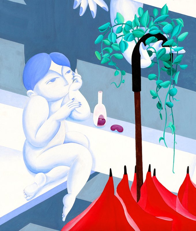 이효선 작가는 인물을 자신만의 규칙으로 표현한다. 파란 피부, 기하학적인 몸의 형태, 입이 없는 얼굴은 작가의 작품 속에 주로 등장하는 인물들의 특징이다. 작가는 파란색에 많은 이야기를 담을 수 있으며 동시에 우리 모두가 감정을 이입할 수 있는 색이라고 말한다. 또한 입이 없는 마스크를 가진 인물은 감정을 읽을 수 있는 대상, 누군지 명확하게 알 수 없다는 점에서 익명성을 가지게 된다. 기하학으로 표현된 몸도 그렇다. 모두에게 있는 공통적 몸의 구성을 단순화시켜 작품 속 인물을 타인이 될 수도 있고 우리 자신이 될 수도 있게 한다. 작가는 감상자 개인의 이야기를 자신의 작품 속에 투영할 수 있는 장치를 설치해 작품으로 하여금 무한한 의미를 가지게 한다.