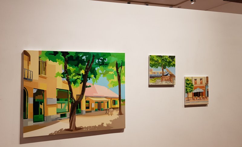 익숙한 풍경이 감각적인 색채로 화면에 그려져 있습니다. 굳이 희귀하거나 거창한 풍경이 아니더라도 작품에 담을 수 있는 소재는 다양하답니다. 주선홍 작가는 특히 우리 일상에서 흔히 지나칠 수 있는 장면들을 화면에 담았습니다. 마치 길을 걷다가, 혹은 카페에서, 잠시 이 순간을 기억하고자 무심코 찍어 본 사진들처럼 작품의 구도 또한 다소 무심한 듯 구성되어 있습니다. 이는 감상자들로 하여금 작품에 더 친숙하게 다가갈 수 있게 한답니다. 일상적이던 풍경도 시간이 지나고 다시 마주하게 되면, 당시의 날씨, 공기, 추억들이 머리와 마음속에 되살아나듯, 작가는 작품을 통해 무미건조하게 지나갈 수 있는 일상을 새롭게 회상해 볼 수 있는 계기를 마련해 줍니다.