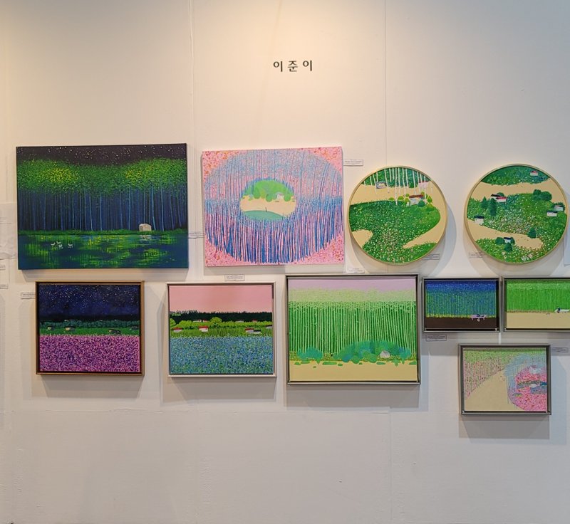 이준이 작가는 천연 염색 보를 사용하여 고향에 대한 향수를 극대화하여 작업한다. 어릴 적 추억을 대표하는 고향 집에 대한 그리움을 동양 전통 기법의 염색 천과 아크릴 물감, 캔버스를 조화롭게 사용하여 화면을 구성한다. 개인을 이루는 것 중 근간이 되는 뿌리에 대한 질문, 작가는 그것을 고향에 대한 그리움, 안타까움 등의 감정으로 정의하고 시각화하여 보여준다. 아득한 기억 속 잊고 지냈던 행복한 장면들이 소환되는 작품은 감상자에게 공감과 위안을 끌어내 편안한 심상을 제공한다.