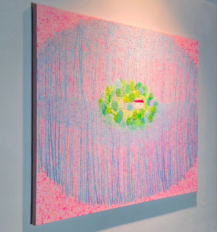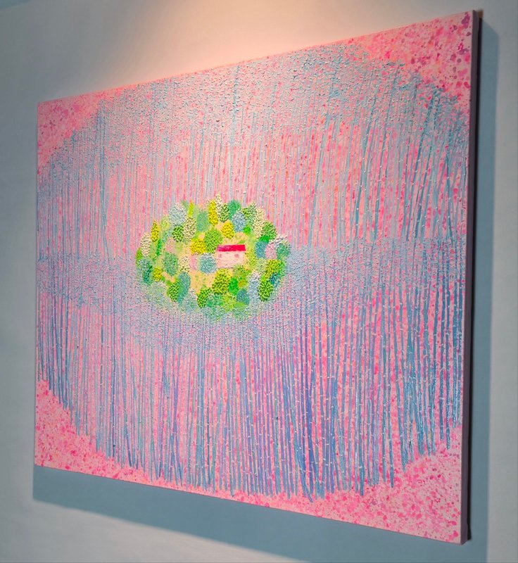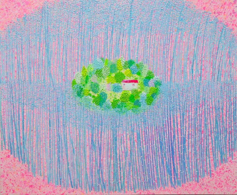 짙은 밤하늘을 수놓은 별빛, 소박하지만 정겹고 익숙한 풍경은 우리가 마음속 간직한 고향에 대한 이미지입니다. 특별한 것 없지만, 일상적인 행복이 가득한 고향 집은 그 자체로 따스한 안정감을 줍니다. 이준이 작가는 타지에서 곧장 갈 수 없어 아쉬운 마음이 더해진 고향에 대한 그리움을 전통 염색 천과 아크릴을 혼합하여 작가만의 확장된 세계를 보여줍니다. 각박한 도시 생활에 지쳐 위로와 휴식이 필요할 때 작품을 보며 따듯한 추억을 회상해 보세요.