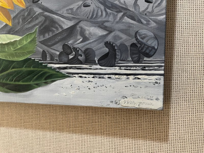 정진아 작가는 광활하고 아름다운 자연의 풍경을 그리지만, 그 풍경의 모습들은 어딘가 모르게 쓸쓸하다. 이는 작가가 유학시절 자유를 만끽하면서도 동시에 외롭고 고독함을 느꼈던 사실과 맞닿아있다. 인간은 결코 완전한 행복을 느낄 수 없다고 말하는 작가는, 오히려 행복이 그 반대항인 고통과 늘 맞물리며 두 가지 감정 상태는 언제나 함께 다가온다고 믿는다. 작품은 이처럼 두 가지 상반된 감정을 담아내기 위해 독특한 도상을 만들어낸다. 채도가 낮은 컬러감과 화면 가득 꼼꼼함이 돋보이는 묘사력은 작가의 메시지를 잘 담아내고 있다.