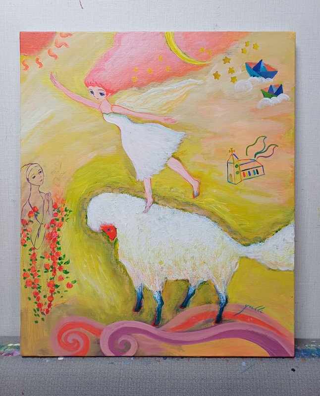 강렬한 컬러들이 뒤섞여있지만 왜인지 모르게 김해진 작가의 작품은 따스하면서 그리운, 어딘가 먹먹한 감정을 뿜어내고 있습니다. 색감을 통해 감정과 심상, 그리고 추억에 관해 이야기하는 작가는, 작품을 통해 감상자로 하여금 각자의 추억과 당시의 심상에 젖어 들게 합니다. 작가는 과거 어머니와의 추억을 회상하고 과거에 대한 심상을 되살려보며 여인의 모습을 화면에 담고 있습니다. 김해진 작가의 작품을 감상하며, 편안하게 우리가 가진 추억들을 되돌아보며 스스로의 마음을 살펴볼 기회가 되었으면 좋겠습니다.