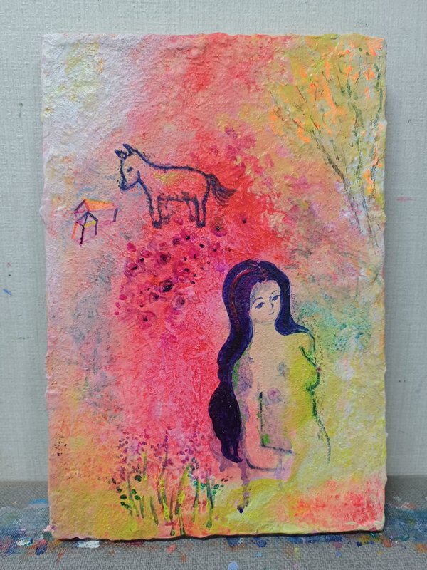 강렬한 컬러들이 뒤섞여있지만 왜인지 모르게 김해진 작가의 작품은 따스하면서 그리운, 어딘가 먹먹한 감정을 뿜어내고 있습니다. 색감을 통해 감정과 심상, 그리고 추억에 관해 이야기하는 작가는, 작품을 통해 감상자로 하여금 각자의 추억과 당시의 심상에 젖어 들게 합니다. 작가는 과거 어머니와의 추억을 회상하고 과거에 대한 심상을 되살려보며 여인의 모습을 화면에 담고 있습니다. 김해진 작가의 작품을 감상하며, 편안하게 우리가 가진 추억들을 되돌아보며 스스로의 마음을 살펴볼 기회가 되었으면 좋겠습니다.