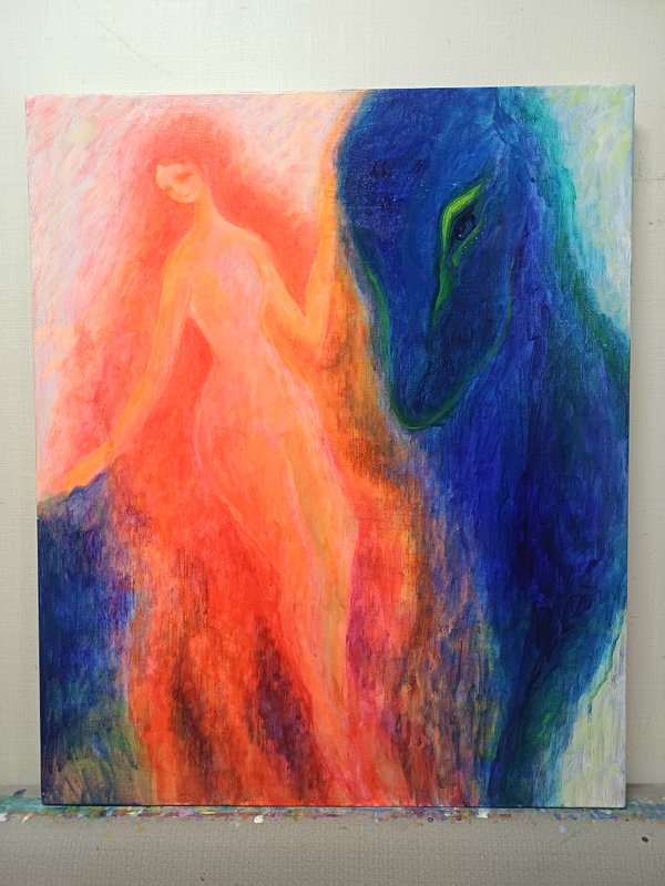강렬한 컬러들이 뒤섞여있지만 왜인지 모르게 김해진 작가의 작품은 따스하면서 그리운, 어딘가 먹먹한 감정을 뿜어내고 있습니다. 색감을 통해 감정과 심상, 그리고 추억에 관해 이야기하는 작가는, 작품을 통해 감상자로 하여금 각자의 추억과 당시의 심상에 젖어 들게 합니다. 작가는 과거 어머니와의 추억을 회상하고 과거에 대한 심상을 되살려보며 여인의 모습을 화면에 담고 있습니다. 김해진 작가의 작품을 감상하며, 편안하게 우리가 가진 추억들을 되돌아보며 스스로의 마음을 살펴볼 기회가 되었으면 좋겠습니다.