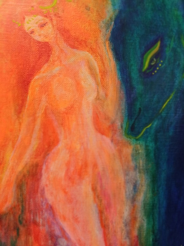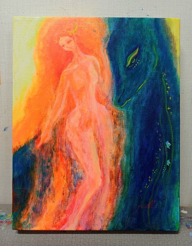 강렬한 컬러들이 뒤섞여있지만 왜인지 모르게 김해진 작가의 작품은 따스하면서 그리운, 어딘가 먹먹한 감정을 뿜어내고 있습니다. 색감을 통해 감정과 심상, 그리고 추억에 관해 이야기하는 작가는, 작품을 통해 감상자로 하여금 각자의 추억과 당시의 심상에 젖어 들게 합니다. 작가는 과거 어머니와의 추억을 회상하고 과거에 대한 심상을 되살려보며 여인의 모습을 화면에 담고 있습니다. 김해진 작가의 작품을 감상하며, 편안하게 우리가 가진 추억들을 되돌아보며 스스로의 마음을 살펴볼 기회가 되었으면 좋겠습니다.