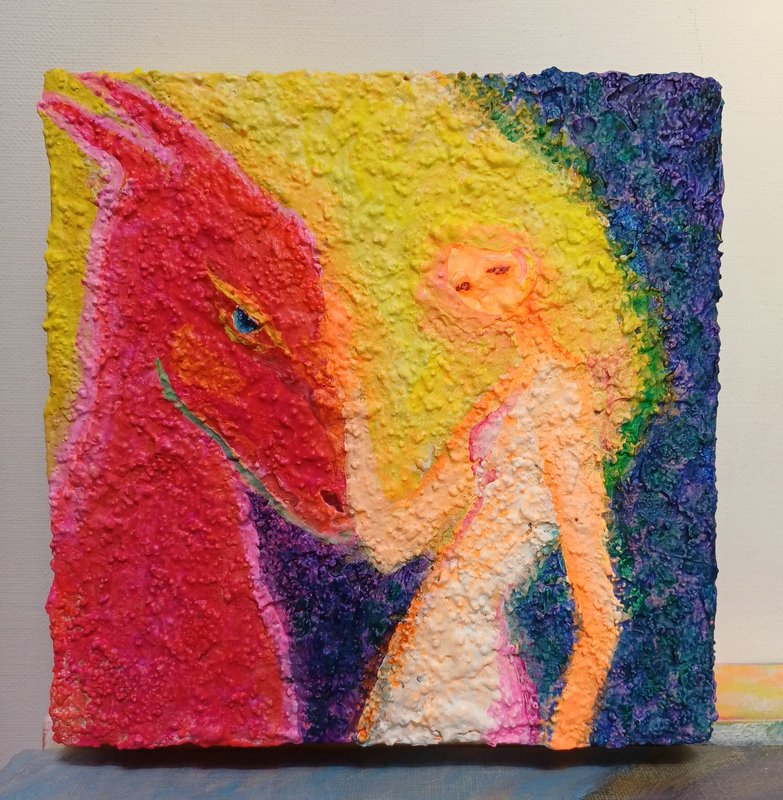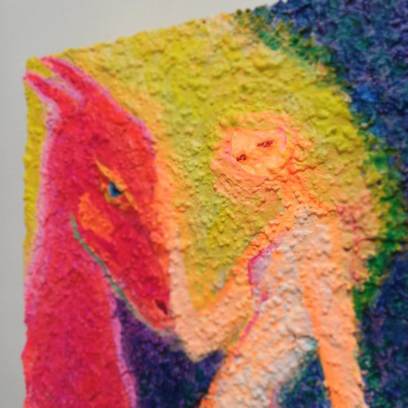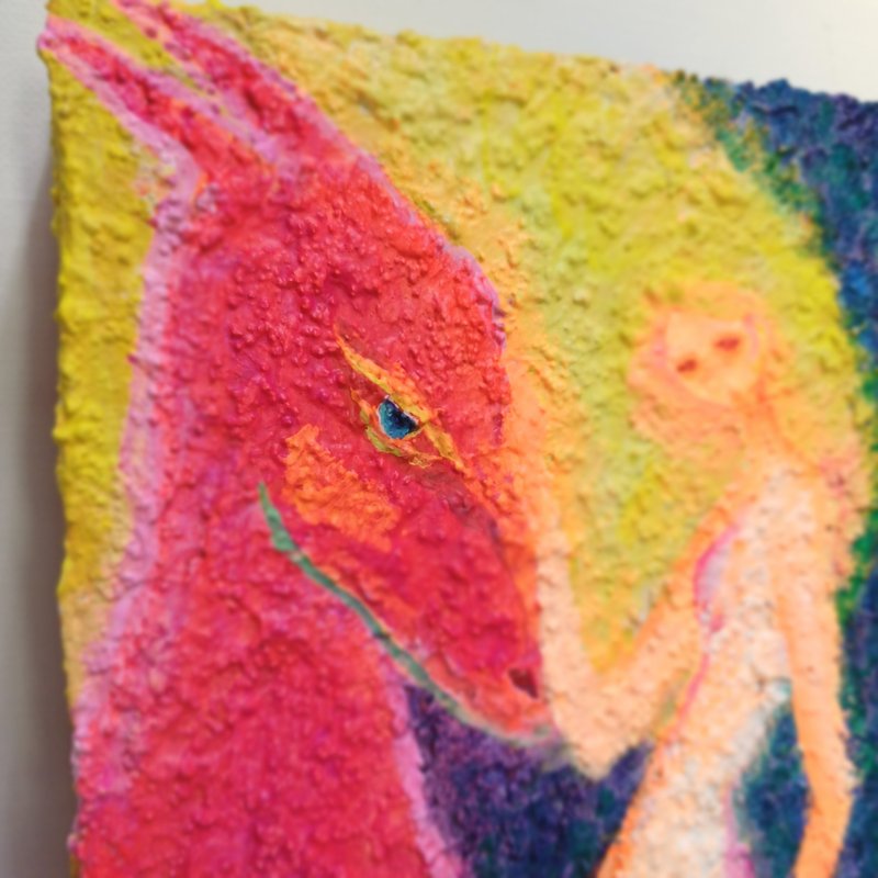강렬한 컬러들이 뒤섞여있지만 왜인지 모르게 김해진 작가의 작품은 따스하면서 그리운, 어딘가 먹먹한 감정을 뿜어내고 있습니다. 색감을 통해 감정과 심상, 그리고 추억에 관해 이야기하는 작가는, 작품을 통해 감상자로 하여금 각자의 추억과 당시의 심상에 젖어 들게 합니다. 작가는 과거 어머니와의 추억을 회상하고 과거에 대한 심상을 되살려보며 여인의 모습을 화면에 담고 있습니다. 김해진 작가의 작품을 감상하며, 편안하게 우리가 가진 추억들을 되돌아보며 스스로의 마음을 살펴볼 기회가 되었으면 좋겠습니다.