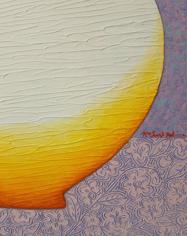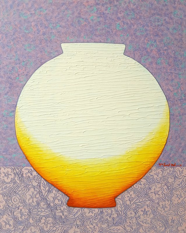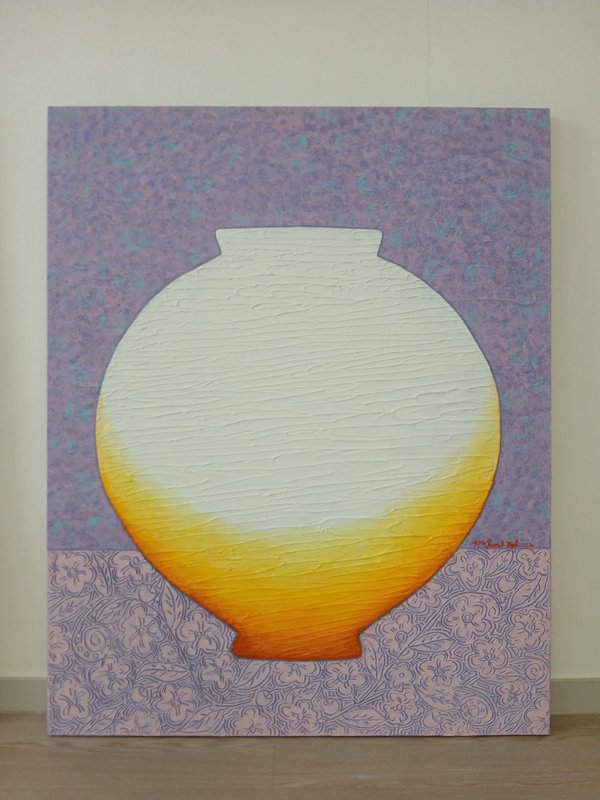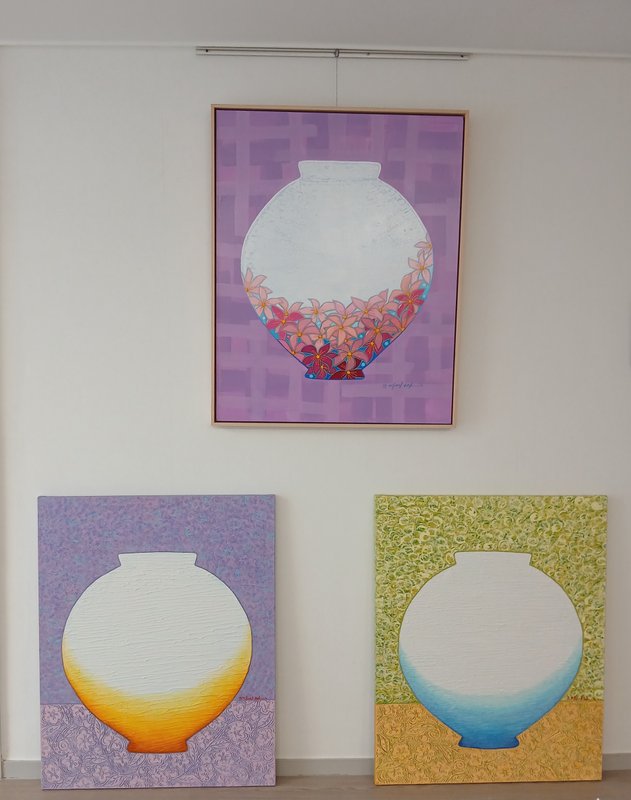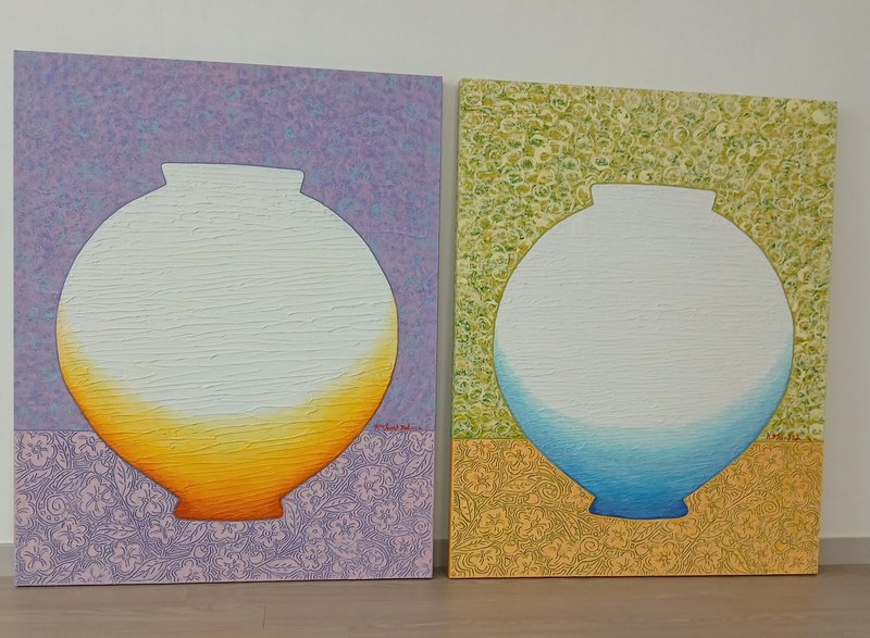 달항아리는 자주 복을 상징하는 물체로 소개되어 왔습니다. 그래서 많은 사람들에게 사랑받고 있기도 하죠. 허명복 작가의 작품을 보면 어쩌면 달항아리에는 정말로 행복을 가져다 주는 기운이 깃들어 있는지도 모르겠다는 생각이 듭니다. 작가는 소중한 지인의 선물로 달항아리 작품을 제작하였고, 이 때에 자신이 행복과 뿌듯한 감정으로 충만해졌던 경험이 계기가 되어 신작에 달항아리를 그리기 시작하였습니다. 작품을 감상하는 이들 또한 행복한 기운을 받았으면 좋겠다는 작가의 소망이 많은 이들에게 닿았으면 좋겠습니다.