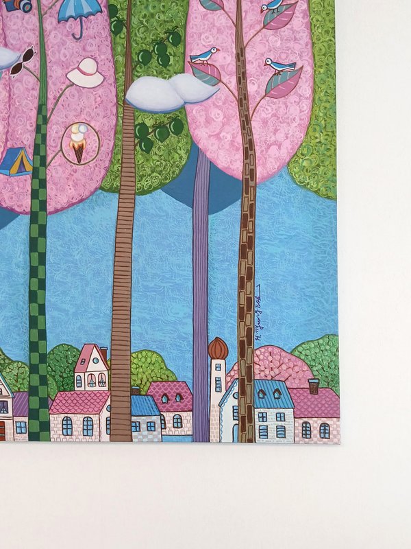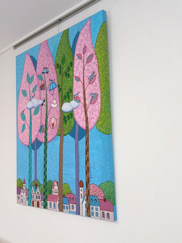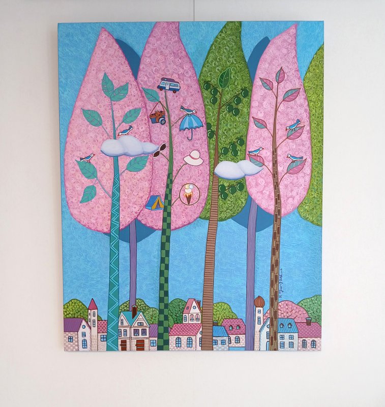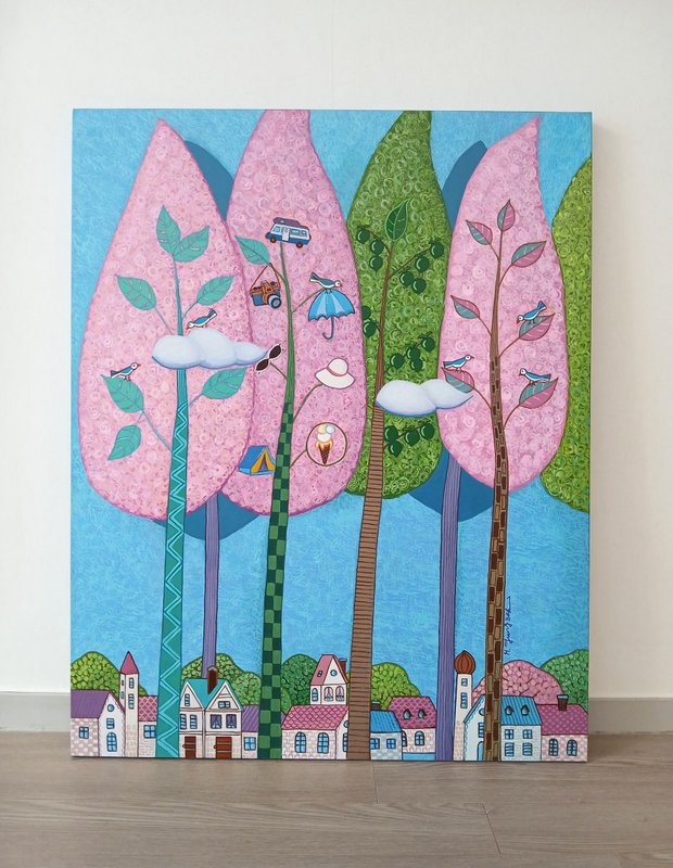 허명복 작가는 자신이 꿈꾸는 상상의 세계를 화면에 담았다. 현실에서 펼쳐질 수 없는 환상적이고 아름다운 분위기가 연출된다. 작품에는 꽃, 나비, 찻주전자, 오리, 물고기 등 다채로운 동식물이 등장한다. 이는 자연 풍경과 함께 동화적이면서도 몽환적인 세계를 창조한다. 알록달록한 다채로운 색감이 시선을 사로잡는 작품으로, 강렬한 인상을 준다. 감상자는 현실의 속박과 굴레에서 벗어나 꿈의 세계와 상상의 나래를 펼치며 자유로운 감성을 느껴볼 수 있다. 형태의 아웃라인을 강조한 선적인 드로잉과 선명한 색면들은 우아하고 장식적인 느낌을 준다. 잠시 멈춰 서서 작품을 감상하면, 작품 속 등장하는 다양한 스토리와 형태를 찾아내는 재미도 느껴볼 수 있다. 중첩된 색감과 독특한 드로잉 기법이 돋보이는 작품으로 행복한 감성을 전달한다.