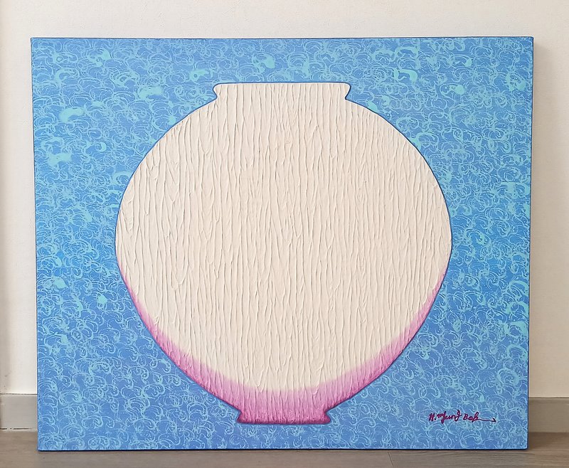 달항아리는 자주 복을 상징하는 물체로 소개되어 왔습니다. 그래서 많은 사람들에게 사랑받고 있기도 하죠. 허명복 작가의 작품을 보면 어쩌면 달항아리에는 정말로 행복을 가져다 주는 기운이 깃들어 있는지도 모르겠다는 생각이 듭니다. 작가는 소중한 지인의 선물로 달항아리 작품을 제작하였고, 이 때에 자신이 행복과 뿌듯한 감정으로 충만해졌던 경험이 계기가 되어 신작에 달항아리를 그리기 시작하였습니다. 작품을 감상하는 이들 또한 행복한 기운을 받았으면 좋겠다는 작가의 소망이 많은 이들에게 닿았으면 좋겠습니다.