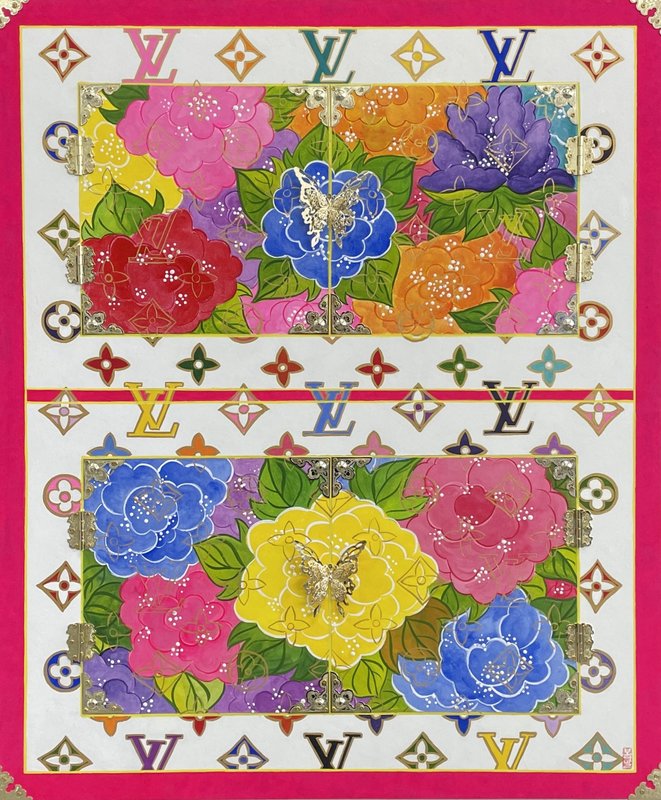 한눈에 보아도 시선을 사로잡는 매력적인 장식성과 색채감이 감상자의 관심을 유발합니다. 장식장이라는 전통 가구 소재 속 가득히 부귀영화를 상징하는 아름다운 꽃밭이 자리 잡고 있습니다. 실제로 가구를 구성하는 경첩, 노리개, 모서리 장식 등의 오브제를 사용하여 평면성에서 벗어나 보다 입체적이고 사실적인 느낌을 더하고 있습니다. 전통의 소재는 예로부터 늘 우리의 곁에 자리 잡은 수호신과 같은 존재로서 이 대상에 대한 존경심이 베어져 있습니다. 부귀영화란 대단한 것이 아닌 가까이 존재해 왔다는 메세지를 전달하며, 우리가 진정 잘 사는 것에 대하여 되돌아보게 만듭니다.