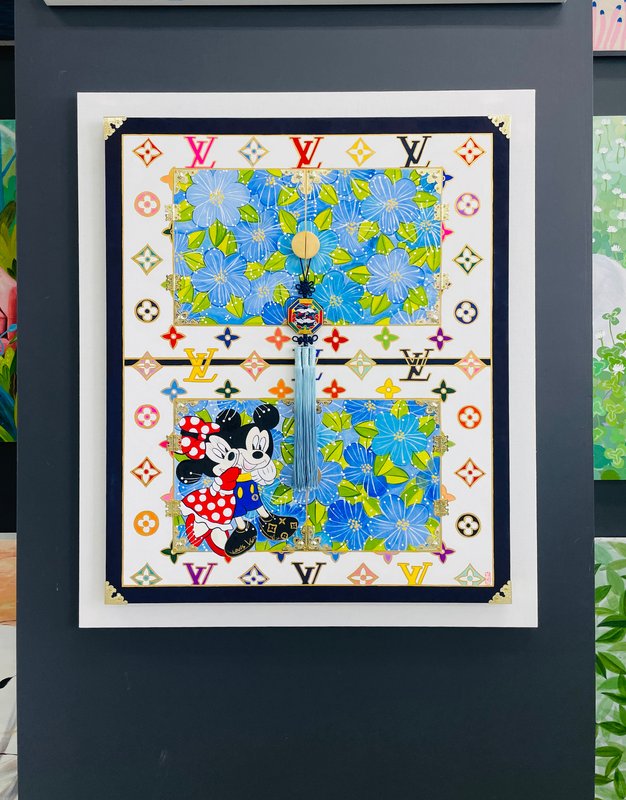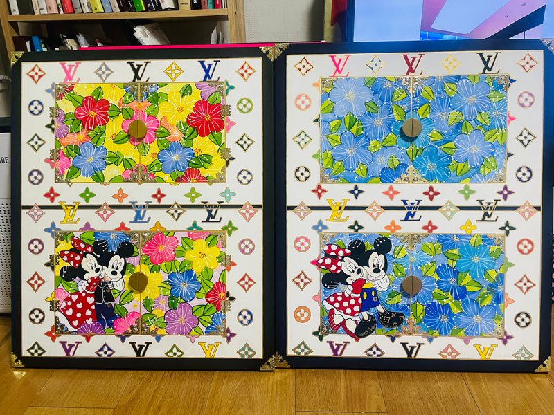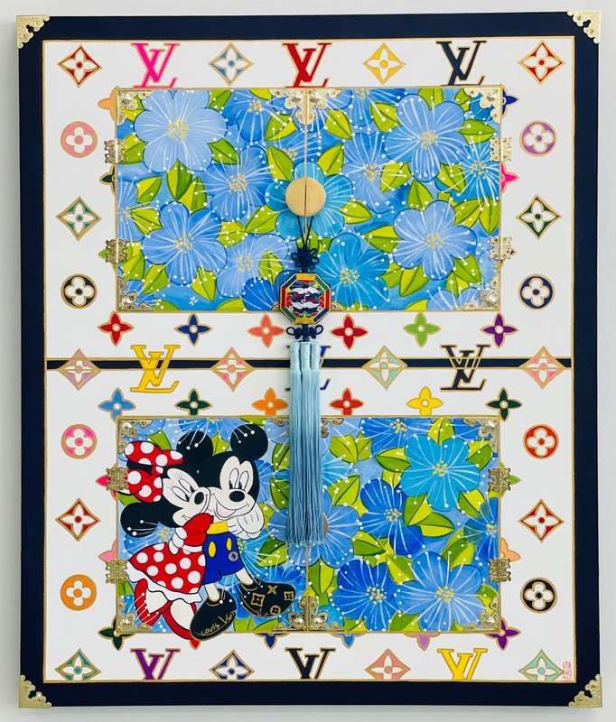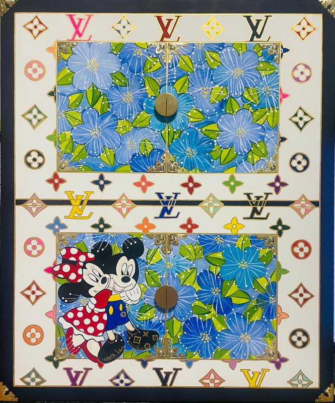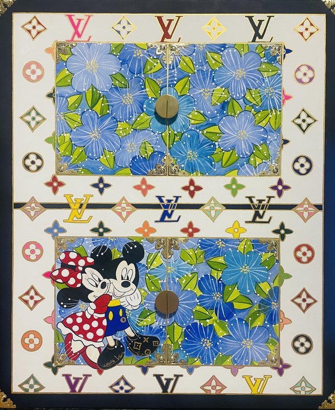 한눈에 보아도 시선을 사로잡는 매력적인 장식성과 색채감이 감상자의 관심을 유발합니다. 장식장이라는 전통 가구 소재 속 가득히 부귀영화를 상징하는 아름다운 꽃밭이 자리 잡고 있습니다. 실제로 가구를 구성하는 경첩, 노리개, 모서리 장식 등의 오브제를 사용하여 평면성에서 벗어나 보다 입체적이고 사실적인 느낌을 더하고 있습니다. 전통의 소재는 예로부터 늘 우리의 곁에 자리 잡은 수호신과 같은 존재로서 이 대상에 대한 존경심이 베어져 있습니다. 부귀영화란 대단한 것이 아닌 가까이 존재해 왔다는 메세지를 전달하며, 우리가 진정 잘 사는 것에 대하여 되돌아보게 만듭니다.