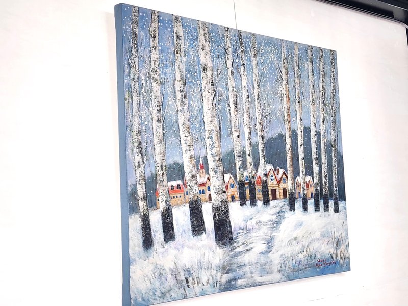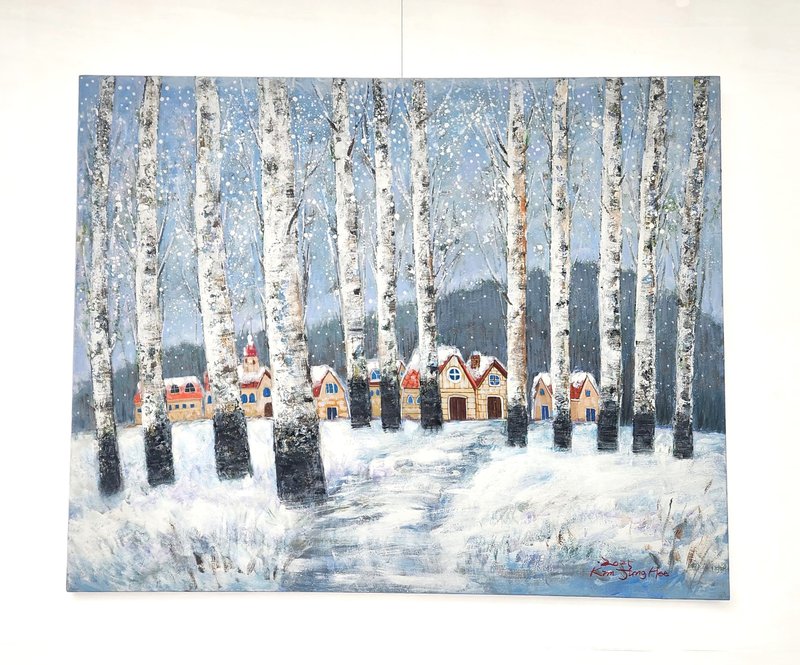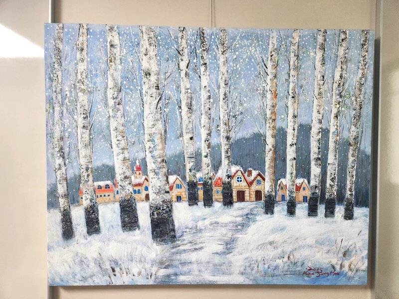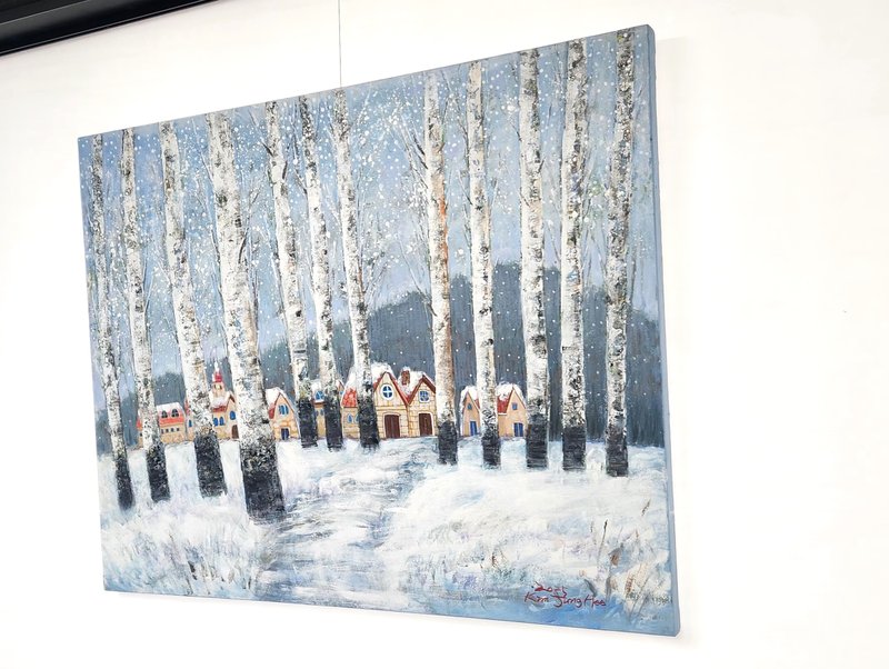 익숙하게 볼 수 있는 자연 풍경이지만 어딘가 더 따스한 느낌이 전해집니다. 김정희 작가는 그저 사실적이거나 섬세한 터치들보다도 자유롭고 색다른 터치와 재료들로 작품을 구성하고 있습니다. 뿌리거나 찍어내는 등의 다양한 터치 방법을 이용하며, 동시에 여러 혼합재료를 사용하여 작가만의 독특한 작품 스타일을 구체화해 가고 있죠. 작가는 복잡하거나 어려운 메시지를 담기보다는 감상자들이 작품으로부터 여유를 찾아갈 수 있도록 하는 것이 목적이라고 말합니다. 작품 속 김정희 작가의 시선이 담긴 자연을 감상하며 작가가 건네는 편안함과 행복감을 느껴보시기를 바랍니다.