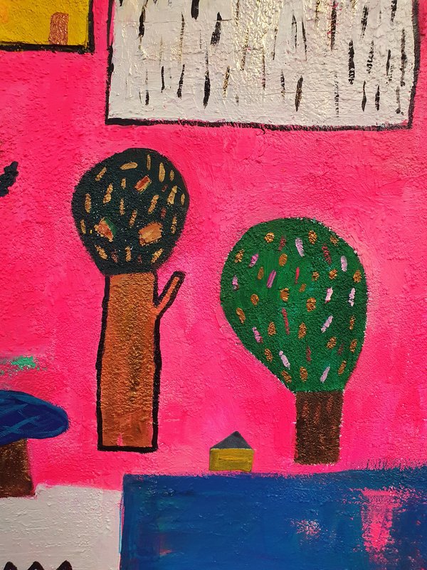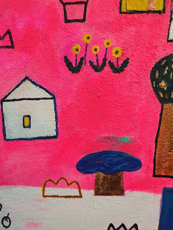 작품에 등장하는 동물, 사물들은 다양한 주인공과 관객이 되어 하나의 장면과 풍경을 연출하고 있다. 이 요소들로 구성된 장면들은 자유로운 상상력을 구현해내고 있다. 집, 나무, 꽃, 동물과 같은 형태를 사용하여 판타지와 같은 상상 속의 장면을 표현하고자 했다. 작품 속 밝은 파스텔톤과 원색적인 컬러감에서는 마치 어린아이와 같은 천진스러운 순수함이 느껴지는 듯하다. 작가는 작품에 소소하면서도 행복한 정서적 충만함을 작품에 표현하여 감상자들과의 소통의 손길을 건네고 있다.