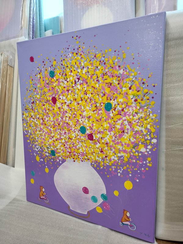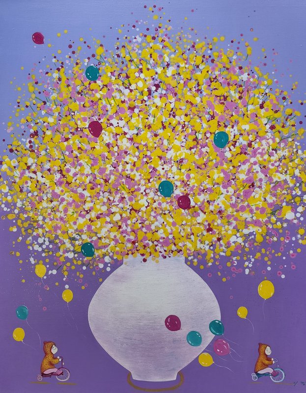 밥그릇 위에 쌀알처럼 소복이 담긴 꽃들과 달 항아리 위에 화사한 꽃가지를 한 아름 꺾어다 둔 듯한 모습들이 보입니다. 그 주위에는 나비가 등장하기도 하고, 방긋한 미소를 띤 작은 사람의 형상이 등장하기도 합니다. 이장옥 작가의 작품은 보는 내내 화사한 꽃다발을 선물 받은 듯 향긋한 행복감이 넘쳐나는 듯합니다. 조형적으로 완벽한 아름다움보다는 부정형의 형태에서 오는 순수함이 특징인 달 항아리는 복을 담는다고 하지요? 작가의 마음이 담긴 듯 밥그릇 위로 소복한 꽃밥에서도 푸근하고 넉넉한 따뜻함이 느껴집니다. 이장옥 작가의 작품을 통해 가내에 행복과 희망, 넘치는 복을 기원하는 마음을 담아 공간을 화사하게 바꾸어 보시는 것은 어떨까요?