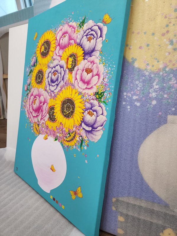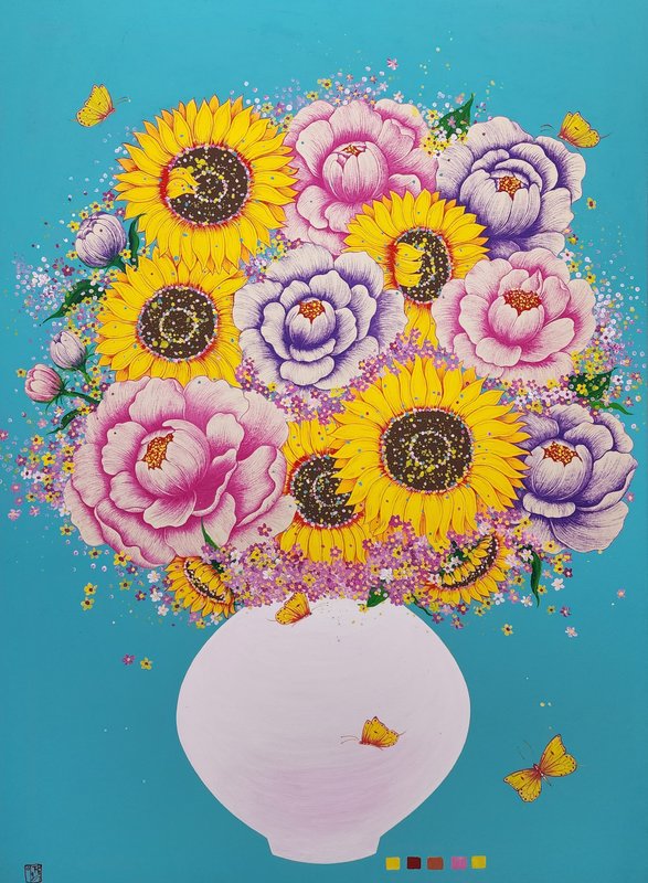 밥그릇 위에 쌀알처럼 소복이 담긴 꽃들과 달 항아리 위에 화사한 꽃가지를 한 아름 꺾어다 둔 듯한 모습들이 보입니다. 그 주위에는 나비가 등장하기도 하고, 방긋한 미소를 띤 작은 사람의 형상이 등장하기도 합니다. 이장옥 작가의 작품은 보는 내내 화사한 꽃다발을 선물 받은 듯 향긋한 행복감이 넘쳐나는 듯합니다. 조형적으로 완벽한 아름다움보다는 부정형의 형태에서 오는 순수함이 특징인 달 항아리는 복을 담는다고 하지요? 작가의 마음이 담긴 듯 밥그릇 위로 소복한 꽃밥에서도 푸근하고 넉넉한 따뜻함이 느껴집니다. 이장옥 작가의 작품을 통해 가내에 행복과 희망, 넘치는 복을 기원하는 마음을 담아 공간을 화사하게 바꾸어 보시는 것은 어떨까요?