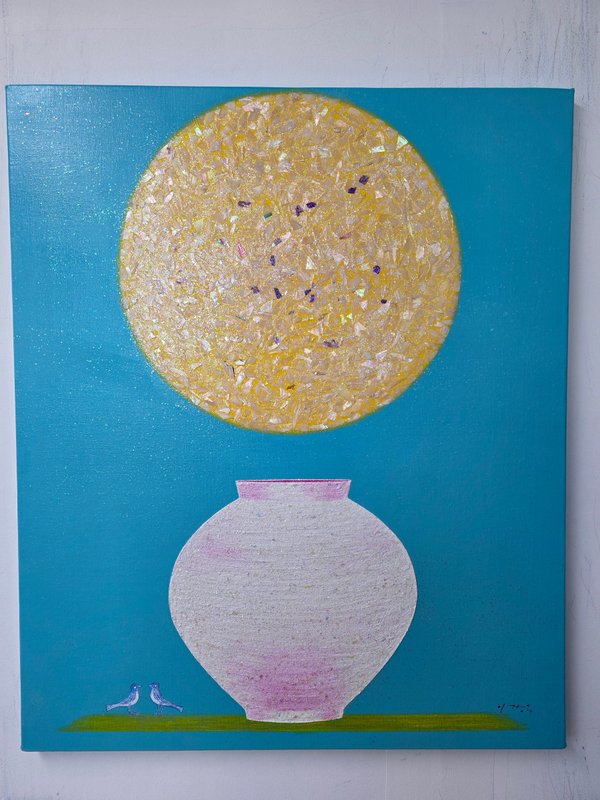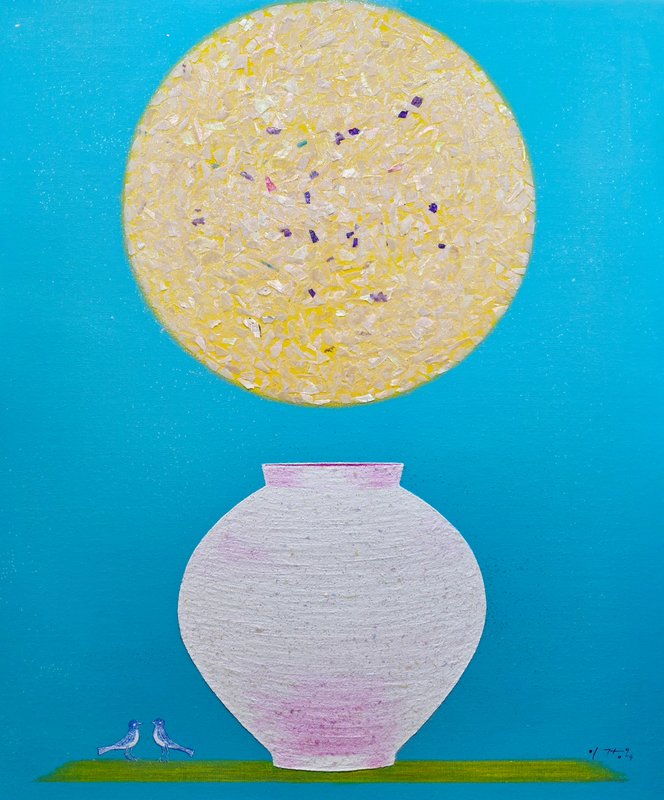 밥그릇 위에 쌀알처럼 소복이 담긴 꽃들과 달 항아리 위에 화사한 꽃가지를 한 아름 꺾어다 둔 듯한 모습들이 보입니다. 그 주위에는 나비가 등장하기도 하고, 방긋한 미소를 띤 작은 사람의 형상이 등장하기도 합니다. 이장옥 작가의 작품은 보는 내내 화사한 꽃다발을 선물 받은 듯 향긋한 행복감이 넘쳐나는 듯합니다. 조형적으로 완벽한 아름다움보다는 부정형의 형태에서 오는 순수함이 특징인 달 항아리는 복을 담는다고 하지요? 작가의 마음이 담긴 듯 밥그릇 위로 소복한 꽃밥에서도 푸근하고 넉넉한 따뜻함이 느껴집니다. 이장옥 작가의 작품을 통해 가내에 행복과 희망, 넘치는 복을 기원하는 마음을 담아 공간을 화사하게 바꾸어 보시는 것은 어떨까요?