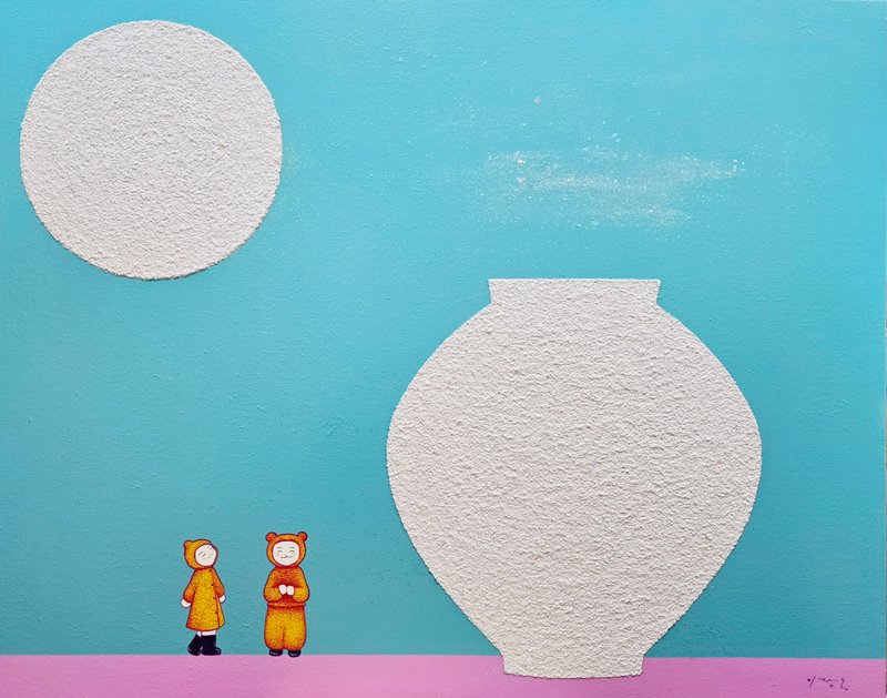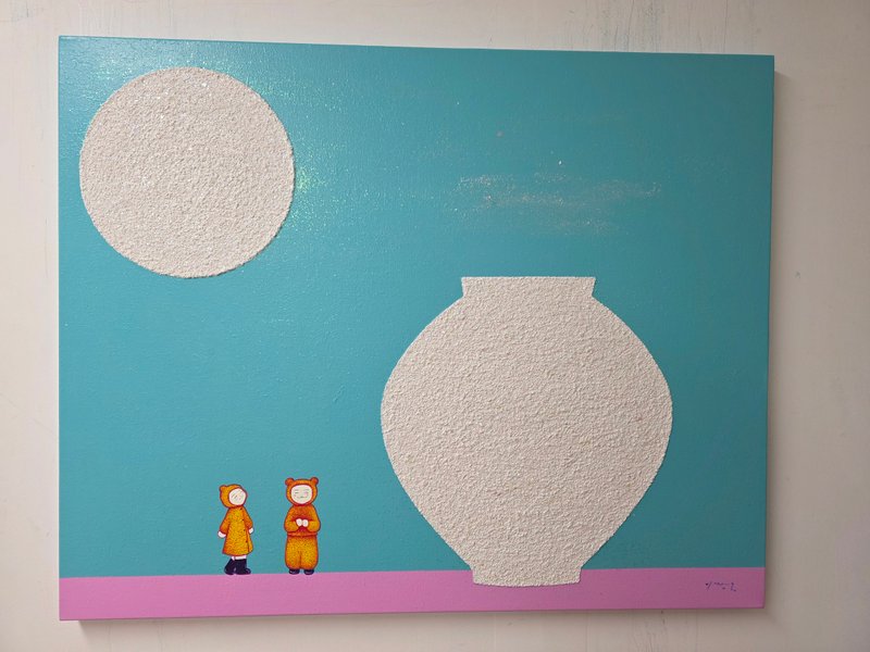 밥그릇 위에 쌀알처럼 소복이 담긴 꽃들과 달 항아리 위에 화사한 꽃가지를 한 아름 꺾어다 둔 듯한 모습들이 보입니다. 그 주위에는 나비가 등장하기도 하고, 방긋한 미소를 띤 작은 사람의 형상이 등장하기도 합니다. 이장옥 작가의 작품은 보는 내내 화사한 꽃다발을 선물 받은 듯 향긋한 행복감이 넘쳐나는 듯합니다. 조형적으로 완벽한 아름다움보다는 부정형의 형태에서 오는 순수함이 특징인 달 항아리는 복을 담는다고 하지요? 작가의 마음이 담긴 듯 밥그릇 위로 소복한 꽃밥에서도 푸근하고 넉넉한 따뜻함이 느껴집니다. 이장옥 작가의 작품을 통해 가내에 행복과 희망, 넘치는 복을 기원하는 마음을 담아 공간을 화사하게 바꾸어 보시는 것은 어떨까요?