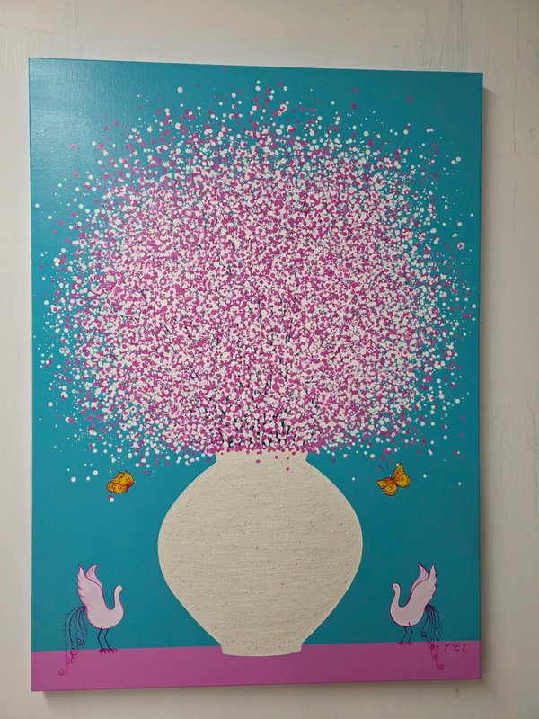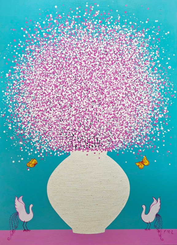 밥그릇 위에 쌀알처럼 소복이 담긴 꽃들과 달 항아리 위에 화사한 꽃가지를 한 아름 꺾어다 둔 듯한 모습들이 보입니다. 그 주위에는 나비가 등장하기도 하고, 방긋한 미소를 띤 작은 사람의 형상이 등장하기도 합니다. 이장옥 작가의 작품은 보는 내내 화사한 꽃다발을 선물 받은 듯 향긋한 행복감이 넘쳐나는 듯합니다. 조형적으로 완벽한 아름다움보다는 부정형의 형태에서 오는 순수함이 특징인 달 항아리는 복을 담는다고 하지요? 작가의 마음이 담긴 듯 밥그릇 위로 소복한 꽃밥에서도 푸근하고 넉넉한 따뜻함이 느껴집니다. 이장옥 작가의 작품을 통해 가내에 행복과 희망, 넘치는 복을 기원하는 마음을 담아 공간을 화사하게 바꾸어 보시는 것은 어떨까요?