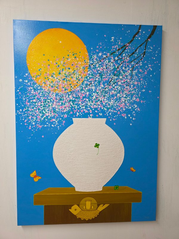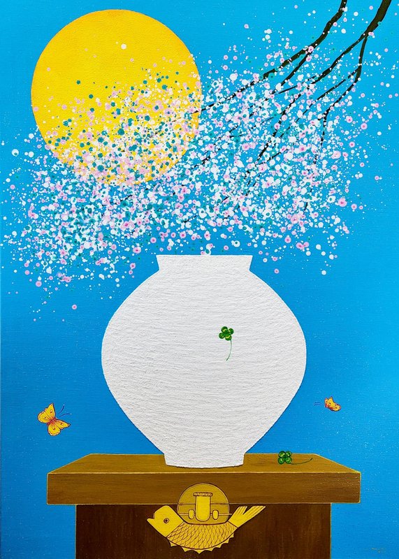 밥그릇 위에 쌀알처럼 소복이 담긴 꽃들과 달 항아리 위에 화사한 꽃가지를 한 아름 꺾어다 둔 듯한 모습들이 보입니다. 그 주위에는 나비가 등장하기도 하고, 방긋한 미소를 띤 작은 사람의 형상이 등장하기도 합니다. 이장옥 작가의 작품은 보는 내내 화사한 꽃다발을 선물 받은 듯 향긋한 행복감이 넘쳐나는 듯합니다. 조형적으로 완벽한 아름다움보다는 부정형의 형태에서 오는 순수함이 특징인 달 항아리는 복을 담는다고 하지요? 작가의 마음이 담긴 듯 밥그릇 위로 소복한 꽃밥에서도 푸근하고 넉넉한 따뜻함이 느껴집니다. 이장옥 작가의 작품을 통해 가내에 행복과 희망, 넘치는 복을 기원하는 마음을 담아 공간을 화사하게 바꾸어 보시는 것은 어떨까요?