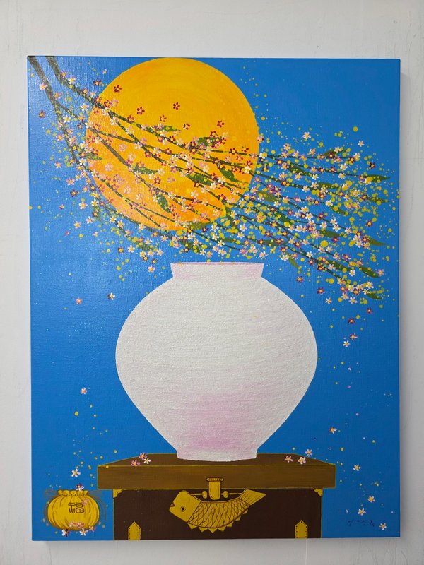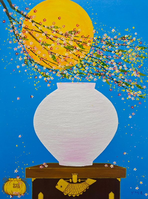 밥그릇 위에 쌀알처럼 소복이 담긴 꽃들과 달 항아리 위에 화사한 꽃가지를 한 아름 꺾어다 둔 듯한 모습들이 보입니다. 그 주위에는 나비가 등장하기도 하고, 방긋한 미소를 띤 작은 사람의 형상이 등장하기도 합니다. 이장옥 작가의 작품은 보는 내내 화사한 꽃다발을 선물 받은 듯 향긋한 행복감이 넘쳐나는 듯합니다. 조형적으로 완벽한 아름다움보다는 부정형의 형태에서 오는 순수함이 특징인 달 항아리는 복을 담는다고 하지요? 작가의 마음이 담긴 듯 밥그릇 위로 소복한 꽃밥에서도 푸근하고 넉넉한 따뜻함이 느껴집니다. 이장옥 작가의 작품을 통해 가내에 행복과 희망, 넘치는 복을 기원하는 마음을 담아 공간을 화사하게 바꾸어 보시는 것은 어떨까요?