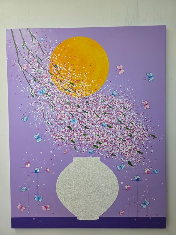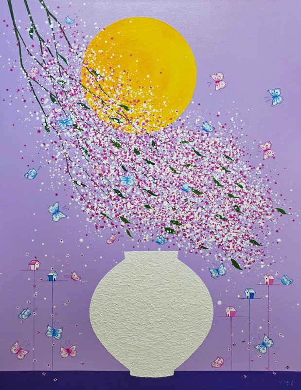 밥그릇 위에 쌀알처럼 소복이 담긴 꽃들과 달 항아리 위에 화사한 꽃가지를 한 아름 꺾어다 둔 듯한 모습들이 보입니다. 그 주위에는 나비가 등장하기도 하고, 방긋한 미소를 띤 작은 사람의 형상이 등장하기도 합니다. 이장옥 작가의 작품은 보는 내내 화사한 꽃다발을 선물 받은 듯 향긋한 행복감이 넘쳐나는 듯합니다. 조형적으로 완벽한 아름다움보다는 부정형의 형태에서 오는 순수함이 특징인 달 항아리는 복을 담는다고 하지요? 작가의 마음이 담긴 듯 밥그릇 위로 소복한 꽃밥에서도 푸근하고 넉넉한 따뜻함이 느껴집니다. 이장옥 작가의 작품을 통해 가내에 행복과 희망, 넘치는 복을 기원하는 마음을 담아 공간을 화사하게 바꾸어 보시는 것은 어떨까요?