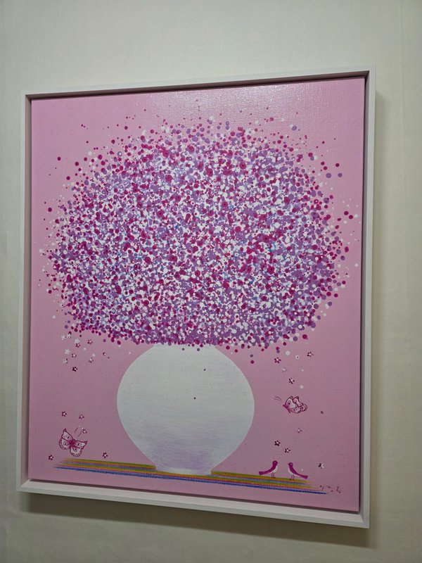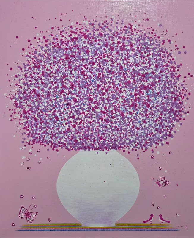 밥그릇 위에 쌀알처럼 소복이 담긴 꽃들과 달 항아리 위에 화사한 꽃가지를 한 아름 꺾어다 둔 듯한 모습들이 보입니다. 그 주위에는 나비가 등장하기도 하고, 방긋한 미소를 띤 작은 사람의 형상이 등장하기도 합니다. 이장옥 작가의 작품은 보는 내내 화사한 꽃다발을 선물 받은 듯 향긋한 행복감이 넘쳐나는 듯합니다. 조형적으로 완벽한 아름다움보다는 부정형의 형태에서 오는 순수함이 특징인 달 항아리는 복을 담는다고 하지요? 작가의 마음이 담긴 듯 밥그릇 위로 소복한 꽃밥에서도 푸근하고 넉넉한 따뜻함이 느껴집니다. 이장옥 작가의 작품을 통해 가내에 행복과 희망, 넘치는 복을 기원하는 마음을 담아 공간을 화사하게 바꾸어 보시는 것은 어떨까요?