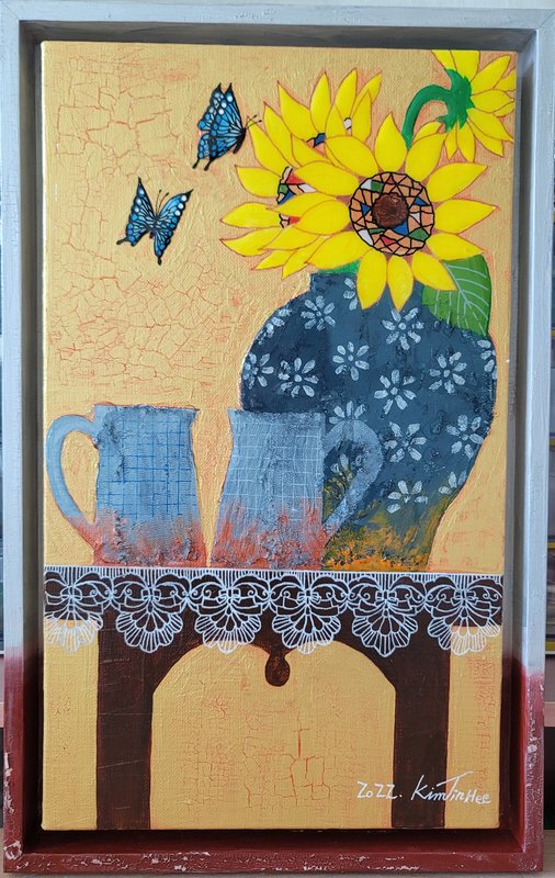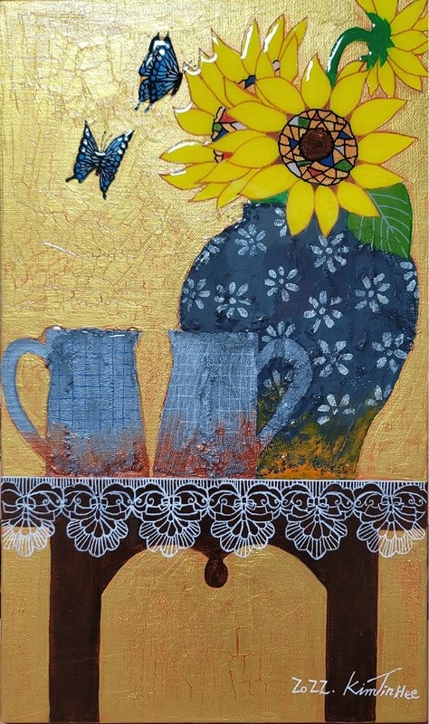 길고 긴 장마 끝, 문득 맑은 하늘빛이 그리워지는 계절이 돌아왔다. 김진희 작가는 인생의 절반쯤에 서 있는 지금, 자신의 절정은 언제였는지 묻곤 한다. 그것은 부와 명예가 아닌 누군가를 따뜻한 마음으로 사랑할 수 있었던 순간과 타인의 손을 따뜻하게 잡아줄 수 있었던 시간이었다. 작가가 작품에 반복적으로 그려 넣는 찻잔이라는 소재는 자신의 기억을 비춰 보이는 기억 주머니와도 같다. 찻잔의 무늬를 보며 그 순간의 기억들인 차를 마시며 상대와 나누었던 이야기, 세월이 흐르며 점차 변하는 빈티지 벽지와 대조되는 찻잔의 온전함이 새로운 느낌을 불러온다고 한다. 또한 투명한 에폭시를 겹겹이 쌓아 올리는 방식으로 도자기의 윤기를 구현하고, 그 표면에 얇고 정제된 색의 층위를 더해 향기와 기억의 잔상을 입체적으로 표현한다. 찬란했던 20대는 바람에 흩날려버린 꽃잎처럼 아쉽기만 하다. 그 시절, 흔들리던 우리를 지탱해주던 소중한 사람을 떠올리며 작가는 오늘도 따뜻한 찻잔 속에 사랑의 기억을 차곡차곡 새겨 넣는다.