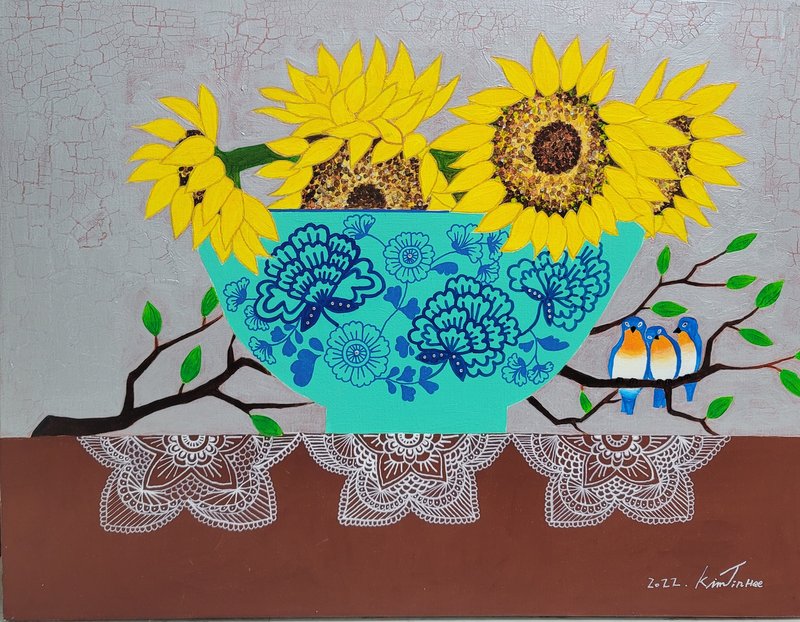 길고 긴 장마 끝, 문득 맑은 하늘빛이 그리워지는 계절이 돌아왔다. 김진희 작가는 인생의 절반쯤에 서 있는 지금, 자신의 절정은 언제였는지 묻곤 한다. 그것은 부와 명예가 아닌 누군가를 따뜻한 마음으로 사랑할 수 있었던 순간과 타인의 손을 따뜻하게 잡아줄 수 있었던 시간이었다. 작가가 작품에 반복적으로 그려 넣는 찻잔이라는 소재는 자신의 기억을 비춰 보이는 기억 주머니와도 같다. 찻잔의 무늬를 보며 그 순간의 기억들인 차를 마시며 상대와 나누었던 이야기, 세월이 흐르며 점차 변하는 빈티지 벽지와 대조되는 찻잔의 온전함이 새로운 느낌을 불러온다고 한다. 또한 투명한 에폭시를 겹겹이 쌓아 올리는 방식으로 도자기의 윤기를 구현하고, 그 표면에 얇고 정제된 색의 층위를 더해 향기와 기억의 잔상을 입체적으로 표현한다. 찬란했던 20대는 바람에 흩날려버린 꽃잎처럼 아쉽기만 하다. 그 시절, 흔들리던 우리를 지탱해주던 소중한 사람을 떠올리며 작가는 오늘도 따뜻한 찻잔 속에 사랑의 기억을 차곡차곡 새겨 넣는다.