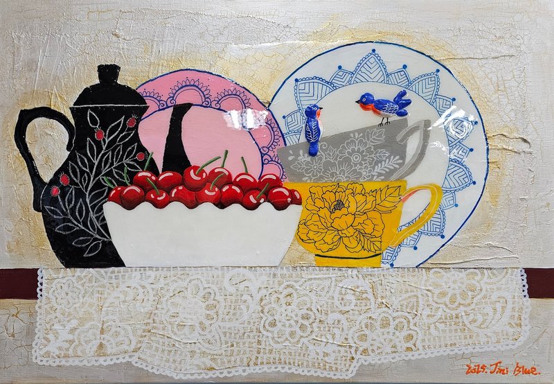 길고 긴 장마 끝, 문득 맑은 하늘빛이 그리워지는 계절이 돌아왔다. 김진희 작가는 인생의 절반쯤에 서 있는 지금, 자신의 절정은 언제였는지 묻곤 한다. 그것은 부와 명예가 아닌 누군가를 따뜻한 마음으로 사랑할 수 있었던 순간과 타인의 손을 따뜻하게 잡아줄 수 있었던 시간이었다. 작가가 작품에 반복적으로 그려 넣는 찻잔이라는 소재는 자신의 기억을 비춰 보이는 기억 주머니와도 같다. 찻잔의 무늬를 보며 그 순간의 기억들인 차를 마시며 상대와 나누었던 이야기, 세월이 흐르며 점차 변하는 빈티지 벽지와 대조되는 찻잔의 온전함이 새로운 느낌을 불러온다고 한다. 또한 투명한 에폭시를 겹겹이 쌓아 올리는 방식으로 도자기의 윤기를 구현하고, 그 표면에 얇고 정제된 색의 층위를 더해 향기와 기억의 잔상을 입체적으로 표현한다. 찬란했던 20대는 바람에 흩날려버린 꽃잎처럼 아쉽기만 하다. 그 시절, 흔들리던 우리를 지탱해주던 소중한 사람을 떠올리며 작가는 오늘도 따뜻한 찻잔 속에 사랑의 기억을 차곡차곡 새겨 넣는다.