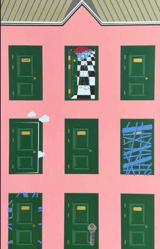 전유리 작가의 작품에는 반듯한 건축물, 격자무늬, 문 등이 추상적인 패턴을 형성하고 있다. 묵묵히, 그리고 남들과 다르지 않은, 모난 데 없는 삶을 살고자 했던 작가의 심정이 엿보이는 소재 선택이 아닐까 싶다. 사회적으로 부여된 수많은 역할을 충실히 수행하다 보면 정작 나라는 사람의 중심이 흔들리기 쉽다. 작가는 그 중심을 다시금 인지하기 위한 시도로 작품에 자신을 대변하는 단단한 건물을 세웠을 것이다. 건물에는 수많은 문들이 닫히거나 아주 조금 열려있는 모습이다. 작가는 자신과 맺고 있는 모든 관계, 그리고 그에 대한 자신의 감정을 문으로 비유하며 '마음의 문'이라는 문구를 시각적으로 풀어냈다.