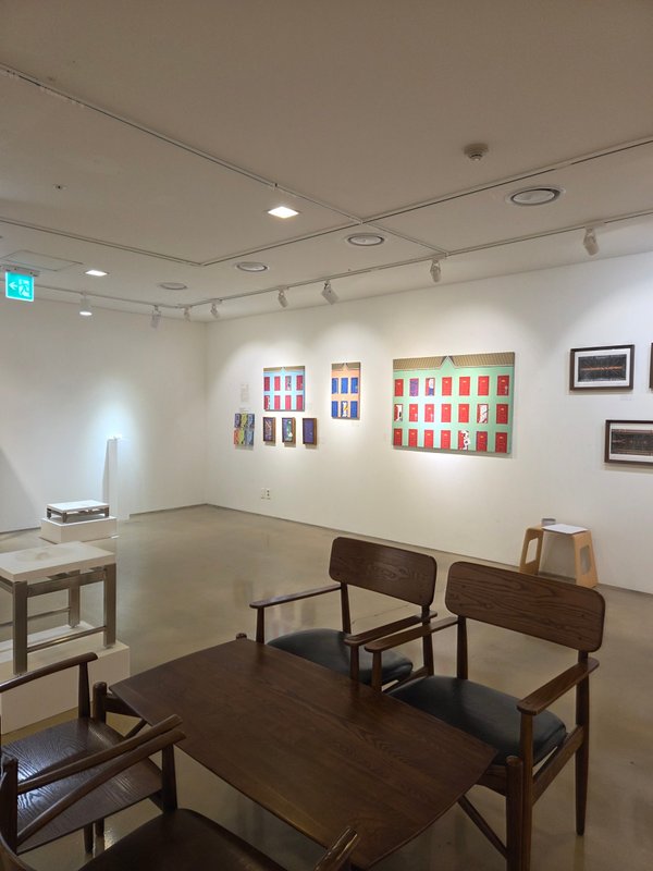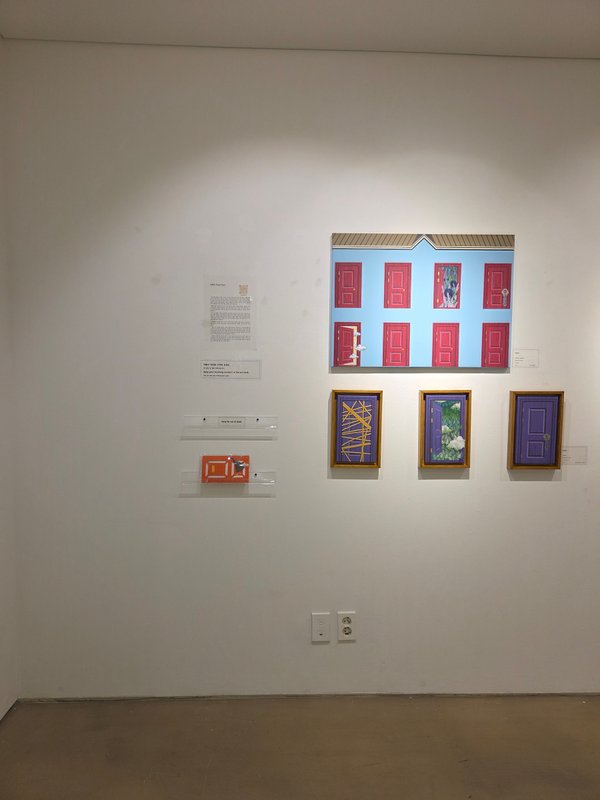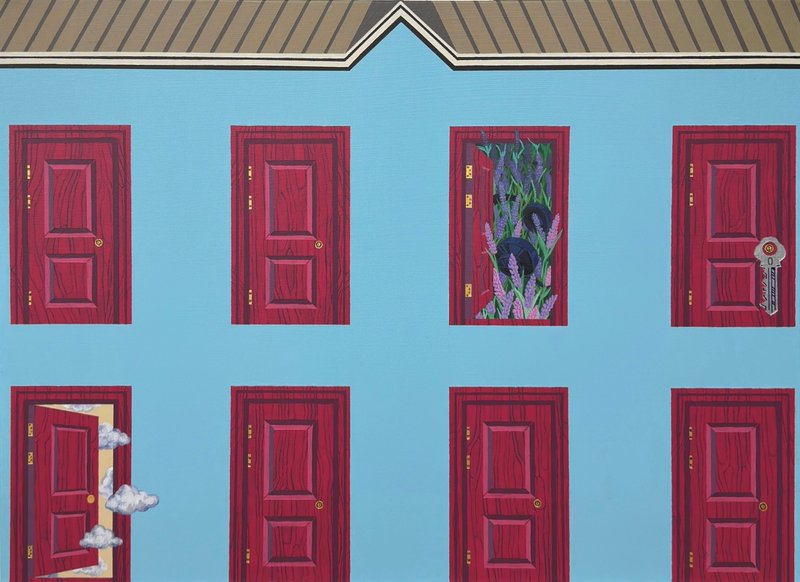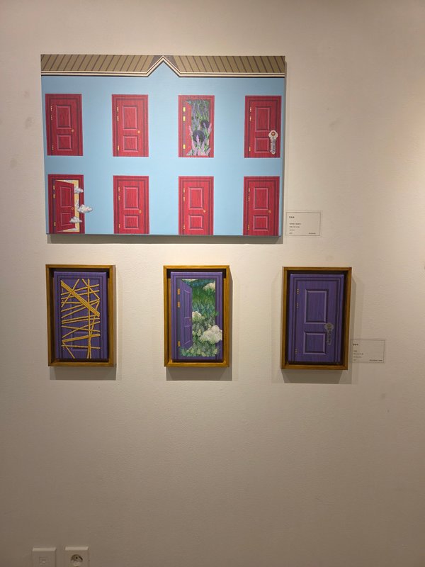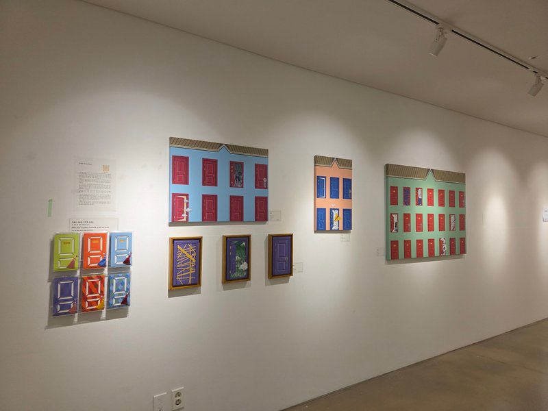 전유리 작가의 작품에는 반듯한 건축물, 격자무늬, 문 등이 추상적인 패턴을 형성하고 있다. 묵묵히, 그리고 남들과 다르지 않은, 모난 데 없는 삶을 살고자 했던 작가의 심정이 엿보이는 소재 선택이 아닐까 싶다. 사회적으로 부여된 수많은 역할을 충실히 수행하다 보면 정작 나라는 사람의 중심이 흔들리기 쉽다. 작가는 그 중심을 다시금 인지하기 위한 시도로 작품에 자신을 대변하는 단단한 건물을 세웠을 것이다. 건물에는 수많은 문들이 닫히거나 아주 조금 열려있는 모습이다. 작가는 자신과 맺고 있는 모든 관계, 그리고 그에 대한 자신의 감정을 문으로 비유하며 '마음의 문'이라는 문구를 시각적으로 풀어냈다.