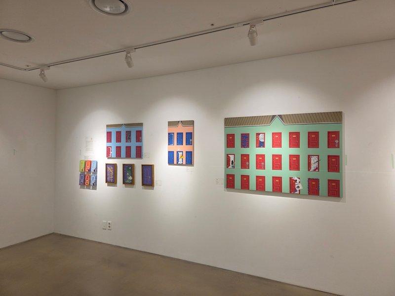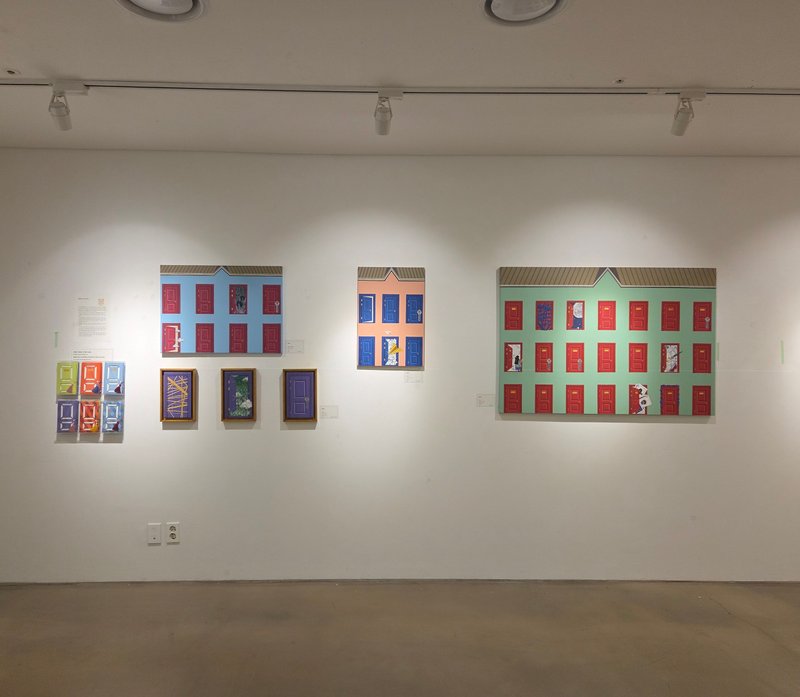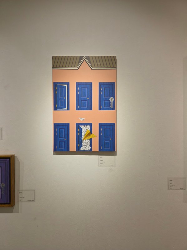 전유리 작가의 작품에는 반듯한 건축물, 격자무늬, 문 등이 추상적인 패턴을 형성하고 있다. 묵묵히, 그리고 남들과 다르지 않은, 모난 데 없는 삶을 살고자 했던 작가의 심정이 엿보이는 소재 선택이 아닐까 싶다. 사회적으로 부여된 수많은 역할을 충실히 수행하다 보면 정작 나라는 사람의 중심이 흔들리기 쉽다. 작가는 그 중심을 다시금 인지하기 위한 시도로 작품에 자신을 대변하는 단단한 건물을 세웠을 것이다. 건물에는 수많은 문들이 닫히거나 아주 조금 열려있는 모습이다. 작가는 자신과 맺고 있는 모든 관계, 그리고 그에 대한 자신의 감정을 문으로 비유하며 '마음의 문'이라는 문구를 시각적으로 풀어냈다.