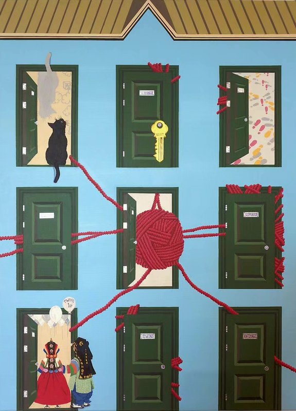 '마음의 문'이라는 표현은 평상시에 흔하게 쓰이는 상투적인 표현입니다. 전유리 작가의 작품에서는 이러한 표현을 시각적으로 풀어낸 것을 확인할 수 있습니다. 작가는 개인의 안식처인 동시에 사회로부터 고립시키는 공간인 집을 자신의 심리를 대변하는 물체로 상정하였습니다. 그리고 집과 외부의 공간이 연결될 수 있도록 하는 문은 조금 열려있기도, 굳게 닫혀있기도 합니다. 활짝 열린 문이 없다는 점에서 작가가 자신의 자아 정체성을 단단히 지키겠다는 의지가 엿보이기도 합니다. 수많은 역할을 수행하는 와중에도 자신이 어떤 사람인지, 내 마음이 어떠한 이야기를 하고 있는지 귀 기울이는 것은 건강한 내면을 가꾸는데 필수 불가결인 태도일 것입니다.