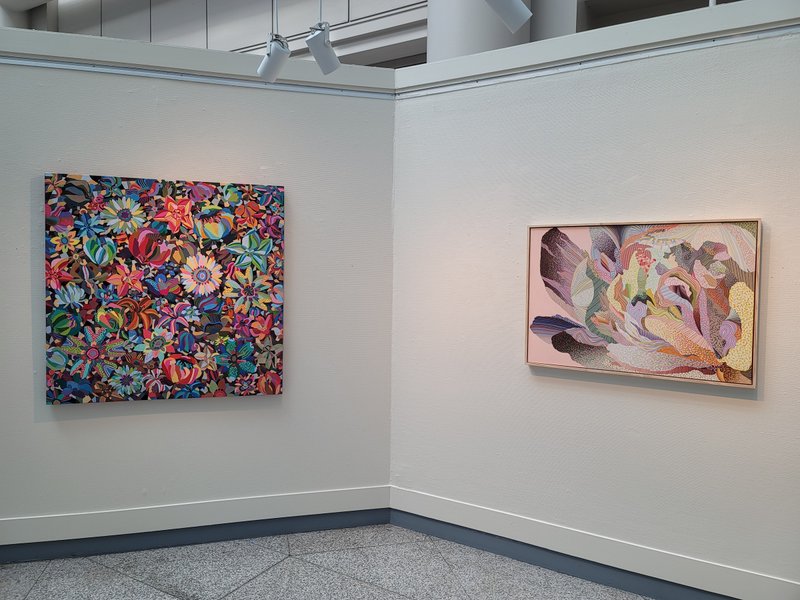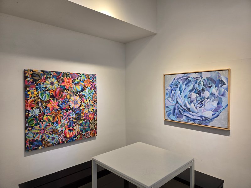 강희주 작가의 작품은 꽃의 형태를 모티브로 출발하지만, 단순히 꽃을 그리는 것이 아니라, 세부적으로 쪼개어 입체감 있게 표현하려고 한다. 작가의 주관적인 감성이 더해져서 세밀하지만 복잡한, 화려한 꽃을 표현했다. 강희주 작가는 단순히 색을 여러 겹 써서 화려함 혹은 아름다움을 재현하려는 것보다는 다양한 색채를 통해 작가의 자아를 전달해 주는 수단이라고 할 수 있다.