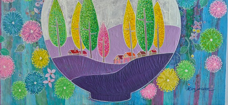 많은 화가는 조형의 기본 단위인 점, 선, 면의 활용에 대한 다양한 탐구를 지속해 왔습니다. 김조원 작가 또한 그러한 작가들과 맥을 같이 하고 있는 것으로 보입니다. 작가는 자연의 풍경에서 위 세 가지 조형 요소들을 활용해 자신이 느낀 인상을 표현하려 하고 있습니다. 이처럼 순수하게 창작의 행위에 임하는 작가의 작품에서는 구상과 비구상의 경계도 허물어지며 틀에 갇힌 표현 양식을 벗어난 자유로운 조형 실험의 태도를 볼 수 있습니다. 화려하게 피어난 꽃은 그 줄기가 어디로 뻗어있는지 가늠할 수 없게 색색의 선과 면으로 그 이면이 막혀있는 모습입니다. 또한 저 멀리까지 뻗은 산속 길은 붉고 푸른 색감으로 비현실적인 인상을 주고 있습니다. 작품에 자신의 상상력을 마음껏 담아내는 일이 너무나 행복하다는 작가의 말처럼 순수한 시선으로 다양한 조형 언어의 말에 귀 기울이는 시간을 가져보시기를 바랍니다.