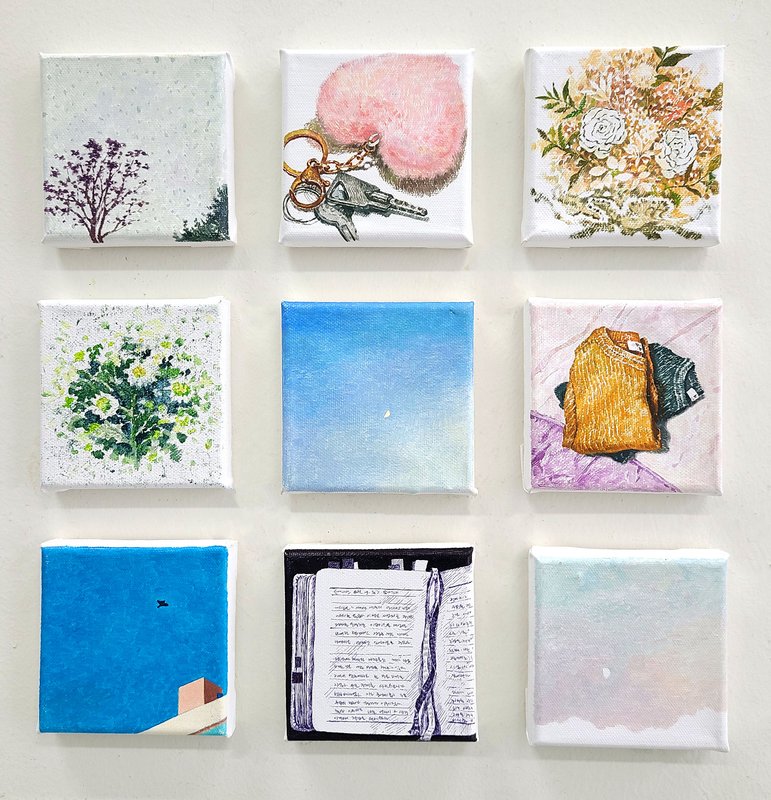 염수윤 작가는 ‘오늘 이 순간’의 소중함에 집중하며 하루하루 감사한 마음으로 살아가고 있는데요, 여러분은 어떠한 생각으로 하루를 살아가고 계신가요? ‘오늘도 몸이 아프지 않고 건강하게 하루를 시작할 수 있게 해 주셔서 감사합니다’, ‘오늘도 내가 좋아하는 음식을 마음껏 먹을 수 있어서 정말 감사합니다’ 또는 ‘오늘도 진심을 다해 나다운 삶을 살 수 있어서 감사합니다’. 이렇게 작가는 평범한 하루 속에서 작고 사소하더라도 감사할 수 있는 순간들을 그림으로 담아냅니다. 작은 크기의 작품이지만, 작가의 기록을 하나씩 모아서 어떤 감사한 순간을 그린 것인지 상상하는 재미가 있습니다. 작가님 일상에서 따뜻하고 소중했던 조각들을 통해 우리도 위로받고 힘을 낼 수 있을 것만 같은데요! 작품들을 감상하시면서, 하루하루의 소중함에 집중하여 삶을 조금 더 긍정적으로 바라보는 것은 어떨까요?