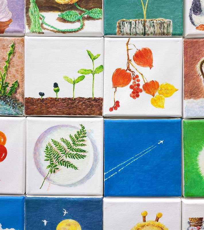 '무엇을 그렸는가?'의 답은 많은 것을 말해줍니다. 섬세하게 종이학을 비추는 빛과 그로 인해 생기는 그림자, 구름이 둘러싼 달, 가을의 한 조각과 같은 순간을 포착한 풍경. 때로는 분필이나 펜과 같은 소소한 물건을 사실적으로 그려내는 염수윤 작가는 자신이 목격한 한순간, 그리고 거기서 무엇을 느꼈는지 작품을 통해 이야기합니다. 우리는 살아가면서 늘 크고 굵직한 사건에서만 무언가를 느끼고 영감을 받지는 않습니다. 작은 것들, 일상적이고 소소한 것들도 우리들의 일상에 사랑, 감사, 위로와 같은 감정을 풍부하게 해줍니다. 이렇게 작고 소중한 순간들은 개인마다 다르게 느낄 테죠. 염수윤 작가는 자신이 따스한 감정들을 느꼈던 그 순간을 시각적으로 표현하고 감상자들에게 공유하고자 합니다. 쉼과 여유를 건네는 염수윤 작가의 작품을 통해 행복한 순간을 공감하는 시간을 가져보면 어떨까요?