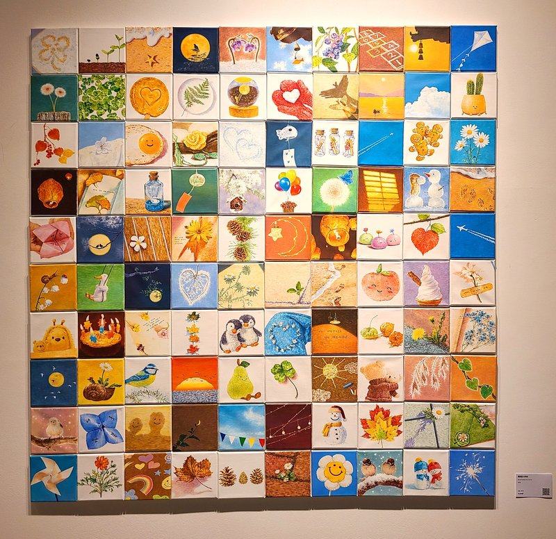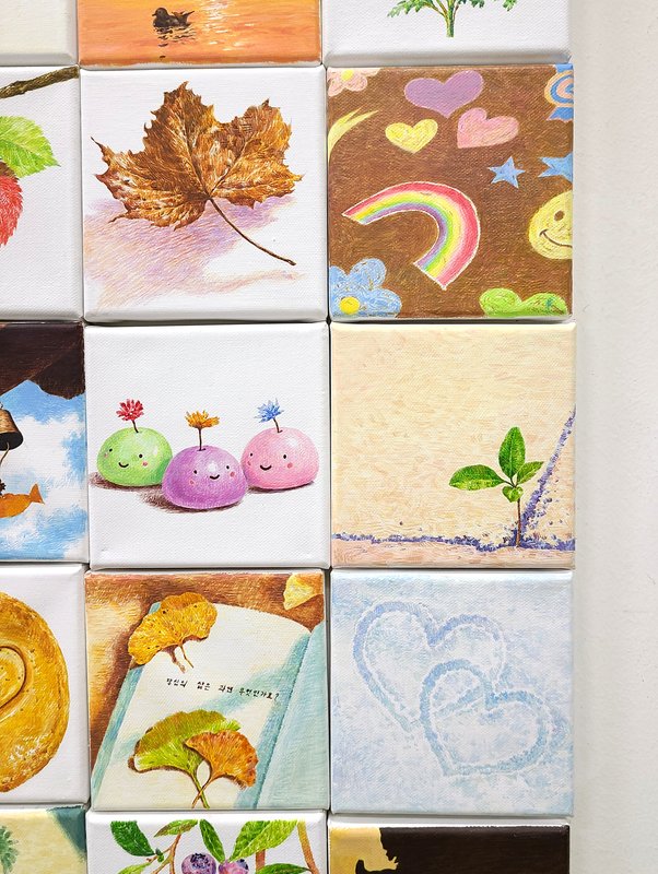 염수윤 작가는 ‘오늘 이 순간’의 소중함에 집중하며 하루하루 감사한 마음으로 살아가고 있는데요, 여러분은 어떠한 생각으로 하루를 살아가고 계신가요? ‘오늘도 몸이 아프지 않고 건강하게 하루를 시작할 수 있게 해 주셔서 감사합니다’, ‘오늘도 내가 좋아하는 음식을 마음껏 먹을 수 있어서 정말 감사합니다’ 또는 ‘오늘도 진심을 다해 나다운 삶을 살 수 있어서 감사합니다’. 이렇게 작가는 평범한 하루 속에서 작고 사소하더라도 감사할 수 있는 순간들을 그림으로 담아냅니다. 작은 크기의 작품이지만, 작가의 기록을 하나씩 모아서 어떤 감사한 순간을 그린 것인지 상상하는 재미가 있습니다. 작가님 일상에서 따뜻하고 소중했던 조각들을 통해 우리도 위로받고 힘을 낼 수 있을 것만 같은데요! 작품들을 감상하시면서, 하루하루의 소중함에 집중하여 삶을 조금 더 긍정적으로 바라보는 것은 어떨까요?