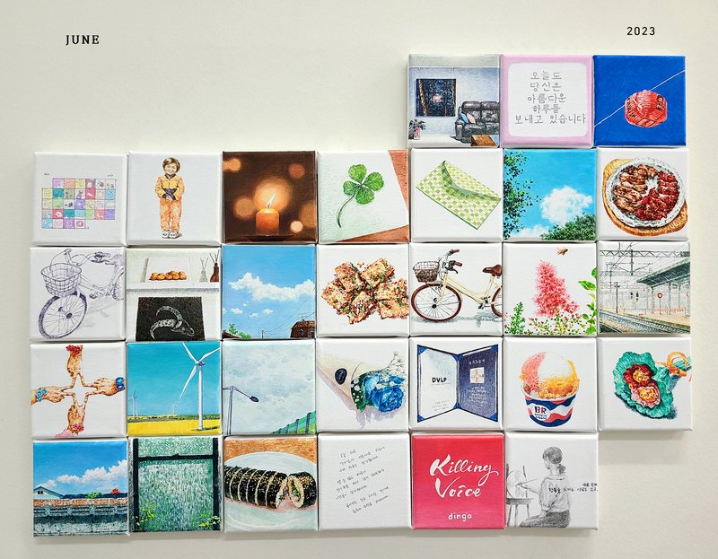 염수윤 작가는 ‘오늘 이 순간’의 소중함에 집중하며 하루하루 감사한 마음으로 살아가고 있는데요, 여러분은 어떠한 생각으로 하루를 살아가고 계신가요? ‘오늘도 몸이 아프지 않고 건강하게 하루를 시작할 수 있게 해 주셔서 감사합니다’, ‘오늘도 내가 좋아하는 음식을 마음껏 먹을 수 있어서 정말 감사합니다’ 또는 ‘오늘도 진심을 다해 나다운 삶을 살 수 있어서 감사합니다’. 이렇게 작가는 평범한 하루 속에서 작고 사소하더라도 감사할 수 있는 순간들을 그림으로 담아냅니다. 작은 크기의 작품이지만, 작가의 기록을 하나씩 모아서 어떤 감사한 순간을 그린 것인지 상상하는 재미가 있습니다. 작가님 일상에서 따뜻하고 소중했던 조각들을 통해 우리도 위로받고 힘을 낼 수 있을 것만 같은데요! 작품들을 감상하시면서, 하루하루의 소중함에 집중하여 삶을 조금 더 긍정적으로 바라보는 것은 어떨까요?
