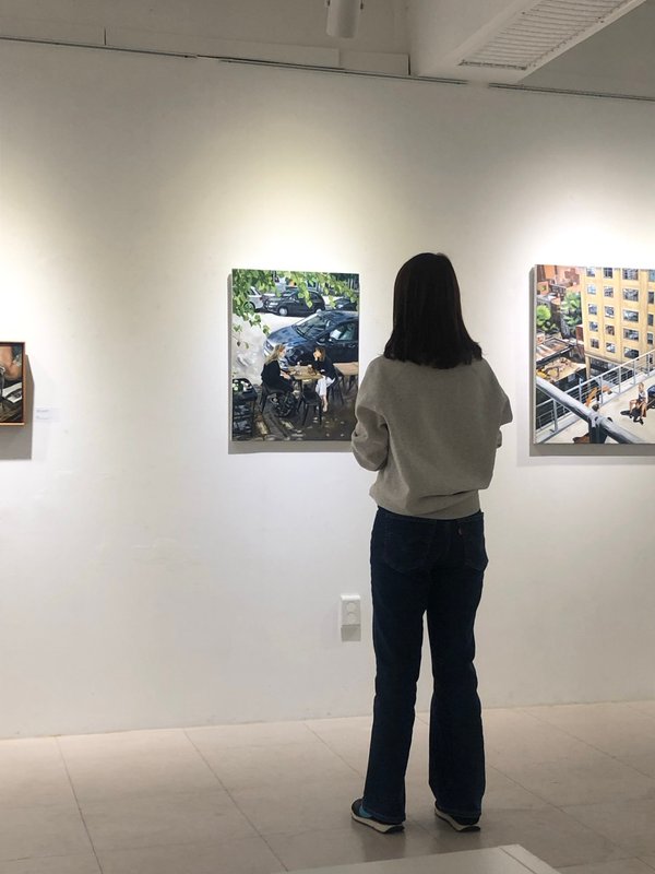 가방 속 뒤죽박죽 섞인 물건들, 그리고 눈앞에 보이는 일상적인 풍경을 사진 찍은 듯이 그대로 담아낸 듯한 작품들은, 작가가 여행하다가 간직하고 싶었던 순간들을 그림으로 담아낸 것입니다. 직접 촬영한 이미지들을 작품으로 옮겨내는 이 행위는, 그저 사실적인 재현을 넘어 우리가 쉽게 무시해 버리는 지극히 평범한 순간과 물건들을 새로운 관점으로 바라보도록 한다는 점에 있어 의미가 있습니다. 안다은 작가가 말하는 '일상'이라는 것은, 우리가 늘 마주하는 사소한 것이기에 오히려 제대로 인지하지 못하거나 바로 보지 못하는 부분입니다. 작가는 여행이라는 특수한 상황을 통해 우리가 쉽게 도외시하는 일상적인 순간 속에 숨어있는 특별함과 흥미로움을 끄집어내어 재조명하고 있습니다. 작품들을 감상하시며, 익숙함에 속아 놓치고 있었던 내 손안의 소소한 재미들과 특별함을 찾아보시는 것은 어떨까요?