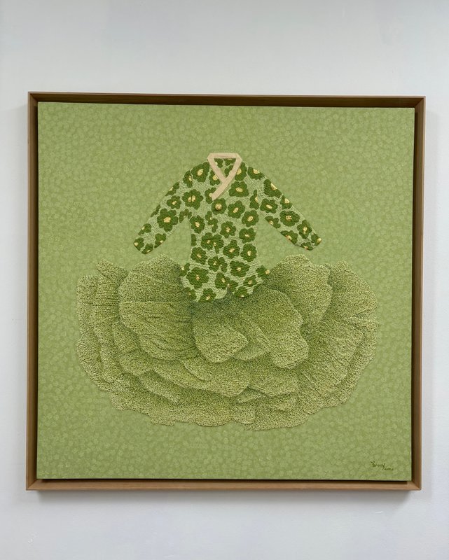 유미영 작가의 작품에서 핵심이 되는 것은 실이다. 작품에서 실은 한 올의 실 그 자체로, 또는 실타래로, 또는 뜨갯것(뜨개질로 만든 물건)으로 존재한다. 실은 과거와 현재, 그리고 미래를 유기적으로 연결하는 매개체이다. 씨실과 날실이 얽히며 새로운 형상과 물건을 이루는 것은 그 모든 인(因)과 과(果)가 연결된 것의 형상화라 할 수 있다. 이렇게 작가는 실이라는 소재를 통해 흐름과 축적, 이음과 봉합, 관계에 대한 이야기를 담아내고 있다. 유미영 작가의 작품 중 뜨갯것을 소재로 하는 작품들에서는 독특한 질감 처리가 돋보인다. 자체적으로 고안해낸 한지 반죽에 실과 손뜨개물을 활용해 질감을 표현하고 점묘법을 사용해 하나하나 점을 찍어가는 기법에서 작가가 작품 한 점에 들이는 시간과 노력을 어렴풋이 짐작해 볼 수 있는 부분이다.