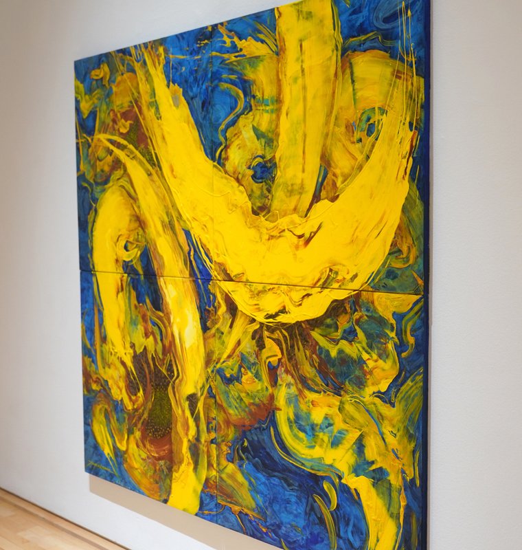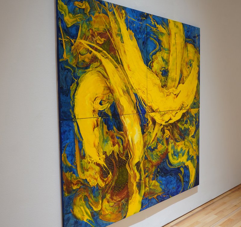 윤옥순 작가는 지난 30여 년간 '지(地)·수(水)·화(花)·풍(風)’을 주제로 작품 활동을 이어왔다. 그중 화(花)에 있어 작가는 불 화(花) 자를 꽃 화(花) 자로 대신하여 작품을 제작한다. 윤옥순 작가가 화폭에 담아내는 해바라기에서는 자연의 생명력이 강하게 드러난다. 꽃의 부분을 클로즈업하여 화면 가득 배치한 구성안에는 섬세하고 디테일한 묘사가 돋보이는 부분부터 붓을 잡은 작가의 움직임과 손길이 그대로 드러나는 터치까지 모두 볼 수 있다. 그런 이유로 작가의 작품 속 꽃은 정적인 이미지로 그저 아름다운 대상으로써만 존재하기보다는, 내재한 에너지가 시각적으로 역동성 있게 드러난다. 구상에서 추상을 은근하게 넘나드는 작가의 표현은 형상의 재현이 아니라, 꽃을 바라보는 이의 감정과 시각, 꽃을 통해 표현하고자 하는 개념을 드러내는 데에 목적이 있다는 것을 알 수 있게 한다.