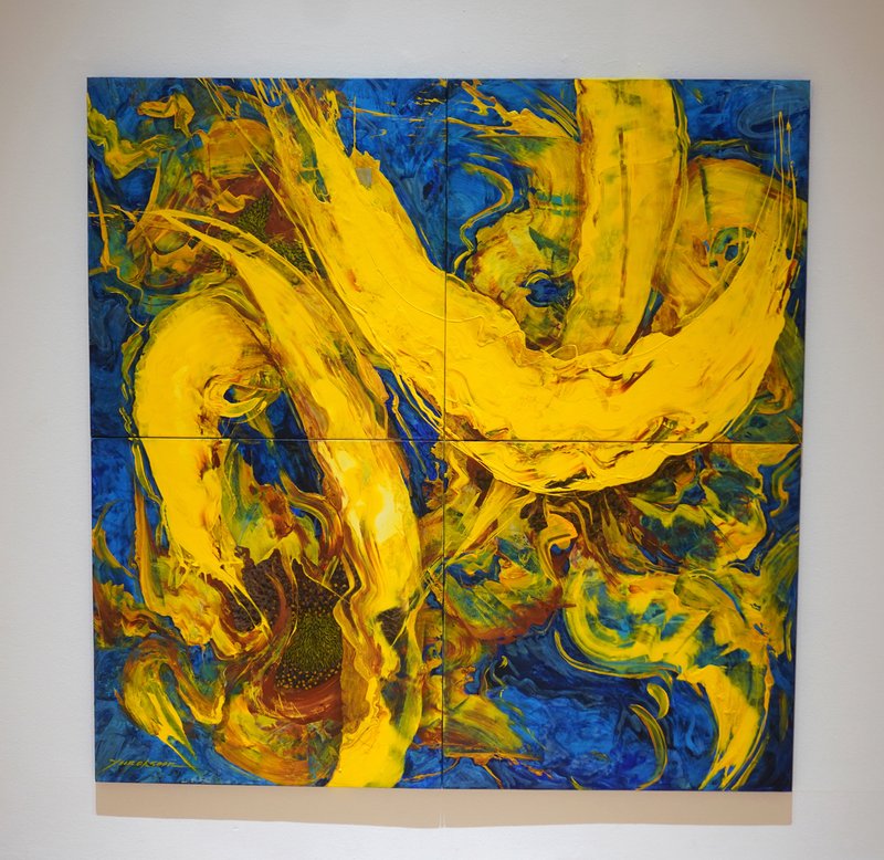 해바라기라는 꽃을 보고 우리가 느끼는 감정들은 무엇일까요? 자기 생명을 태워 한결같이 태양 빛을 쫓아 바라보는 그 집념과 열정. 우리는 아마 그 한결같은 모습에서 매력을 느끼는 것일지도 모릅니다. 윤옥순 작가는 해바라기를 열정과 연관 짓고 있습니다. 정밀한 디테일 묘사보다는 약간의 추상성을 띤 형상은 해바라기라는 대상을 바라보는 작가의 시선이 담긴 부분이 아닐까 합니다. 해바라기의 노란빛을 구현하기 위해 사용된 수많은 색감이 자유롭게 흐르는 모양새는 마치 작열하는 태양 빛을 닮은 듯도 하지 않나요? 윤옥순 작가의 해바라기 작품들이 품은 복합적인 빛깔과 마치 뜨거운 정열을 품은 듯한 감각적인 터치는 공간 안에 색다른 포인트가 되어줄 것입니다.