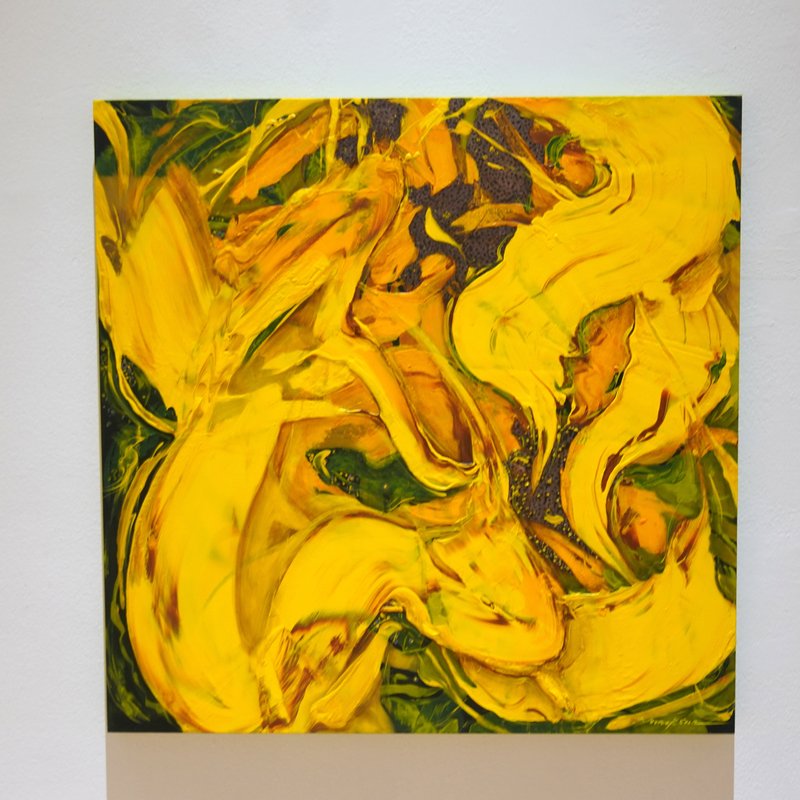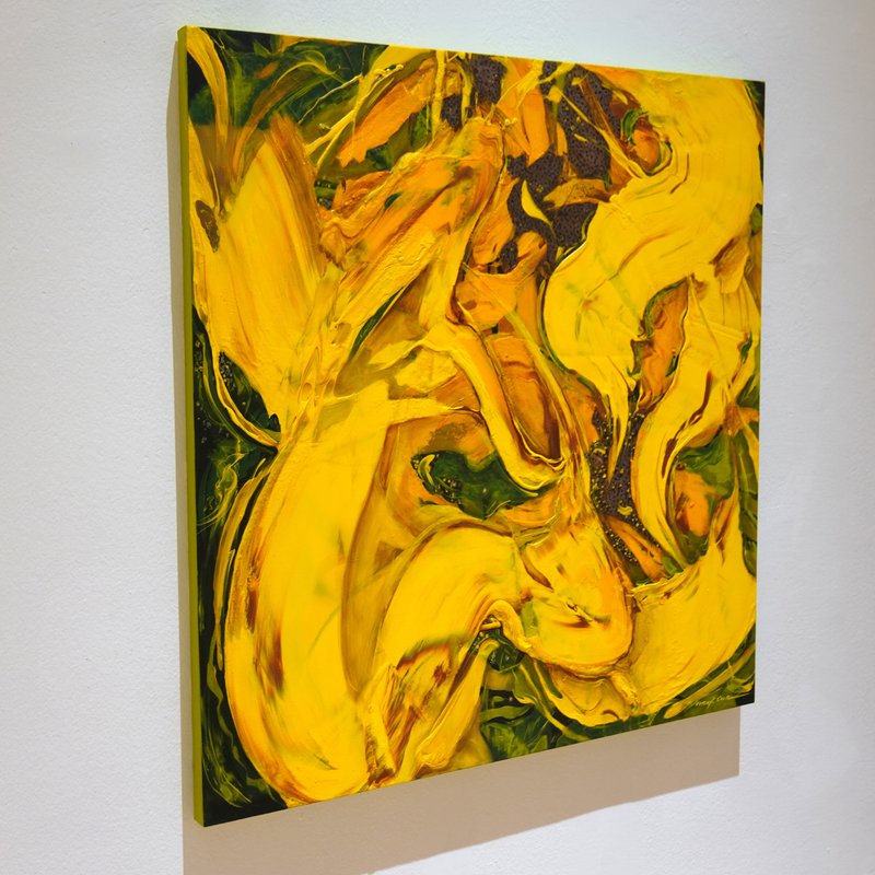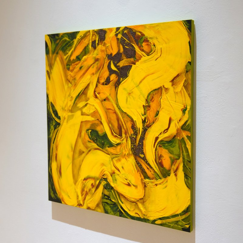 해바라기라는 꽃을 보고 우리가 느끼는 감정들은 무엇일까요? 자기 생명을 태워 한결같이 태양 빛을 쫓아 바라보는 그 집념과 열정. 우리는 아마 그 한결같은 모습에서 매력을 느끼는 것일지도 모릅니다. 윤옥순 작가는 해바라기를 열정과 연관 짓고 있습니다. 정밀한 디테일 묘사보다는 약간의 추상성을 띤 형상은 해바라기라는 대상을 바라보는 작가의 시선이 담긴 부분이 아닐까 합니다. 해바라기의 노란빛을 구현하기 위해 사용된 수많은 색감이 자유롭게 흐르는 모양새는 마치 작열하는 태양 빛을 닮은 듯도 하지 않나요? 윤옥순 작가의 해바라기 작품들이 품은 복합적인 빛깔과 마치 뜨거운 정열을 품은 듯한 감각적인 터치는 공간 안에 색다른 포인트가 되어줄 것입니다.