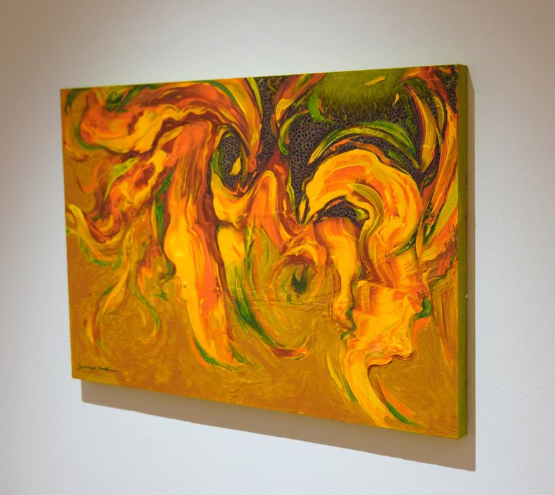 윤옥순 작가는 지난 30여 년간 '지(地)·수(水)·화(花)·풍(風)’을 주제로 작품 활동을 이어왔다. 그중 화(花)에 있어 작가는 불 화(花) 자를 꽃 화(花) 자로 대신하여 작품을 제작한다. 윤옥순 작가가 화폭에 담아내는 해바라기에서는 자연의 생명력이 강하게 드러난다. 꽃의 부분을 클로즈업하여 화면 가득 배치한 구성안에는 섬세하고 디테일한 묘사가 돋보이는 부분부터 붓을 잡은 작가의 움직임과 손길이 그대로 드러나는 터치까지 모두 볼 수 있다. 그런 이유로 작가의 작품 속 꽃은 정적인 이미지로 그저 아름다운 대상으로써만 존재하기보다는, 내재한 에너지가 시각적으로 역동성 있게 드러난다. 구상에서 추상을 은근하게 넘나드는 작가의 표현은 형상의 재현이 아니라, 꽃을 바라보는 이의 감정과 시각, 꽃을 통해 표현하고자 하는 개념을 드러내는 데에 목적이 있다는 것을 알 수 있게 한다.