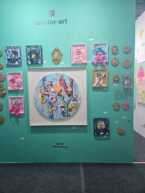 엘리 황 작가는 우리 일상에서 사라지고 있는 전단지, 잡지 등을 이용해 콜라주 작업을 한다. 종이를 층층이 쌓아 올린 후 그라인더로 갈고 다시 쌓아 올리는 반복적인 작업을 통해 우리가 어릴 적 보아왔던 캐릭터들을 그려낸다. 연약한 종이는 이 과정을 통해 돌처럼 딱딱해지며 새로운 형태를 보이게 된다. 작가가 그려낸 캐릭터들은 작업 도중 어려움에 부닥칠 때 도와주는 조력자이자 함께 매번 수 없이 시도하는 작은 일에 같이 기뻐해 주는 동고동락의 존재이다. 종이처럼 연약하지만 순수하게 세상을 바라보았던 어린 시절의 기억을 생각하며 순수성과 돌과같이 견고한 현실의 타협을 작품에 담아낸다.