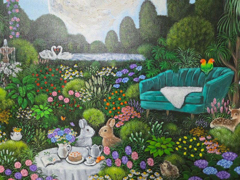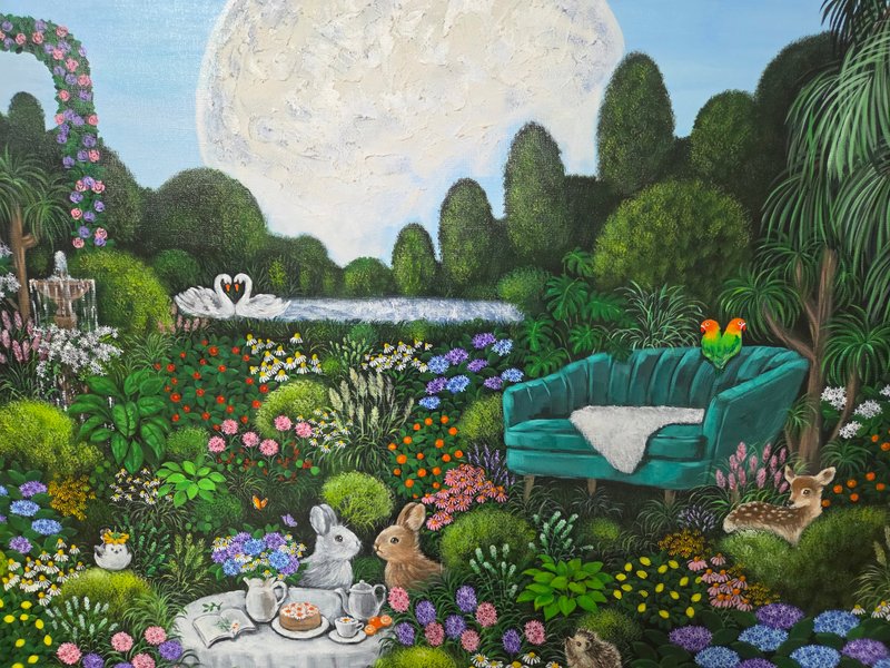 싱그러운 잎사귀, 다채로운 꽃. 썬키 작가는 자신이 생각하는 유토피아적 공간을 화면에 담아냅니다. 일상 속 상처받았던 일들을 모두 잊고 치유 받을 수 있는 공간을 만들어내, 그 공간에서만큼은 누구나 휴식할 수 있도록 꿈꿉니다. 화면 속 시원하고 굵직한 붓 터치와 자연의 색감은 삶의 에너지를 선사하고 토끼, 새, 사슴 등 귀여운 동물들은 외롭지 않도록 친구가 되어줍니다. 썬키 작가가 구현해 낸 환상적인 자연의 공간 속에서 현실에서 벗어나 잠시 쉬어 갈 수 있길 바랍니다.