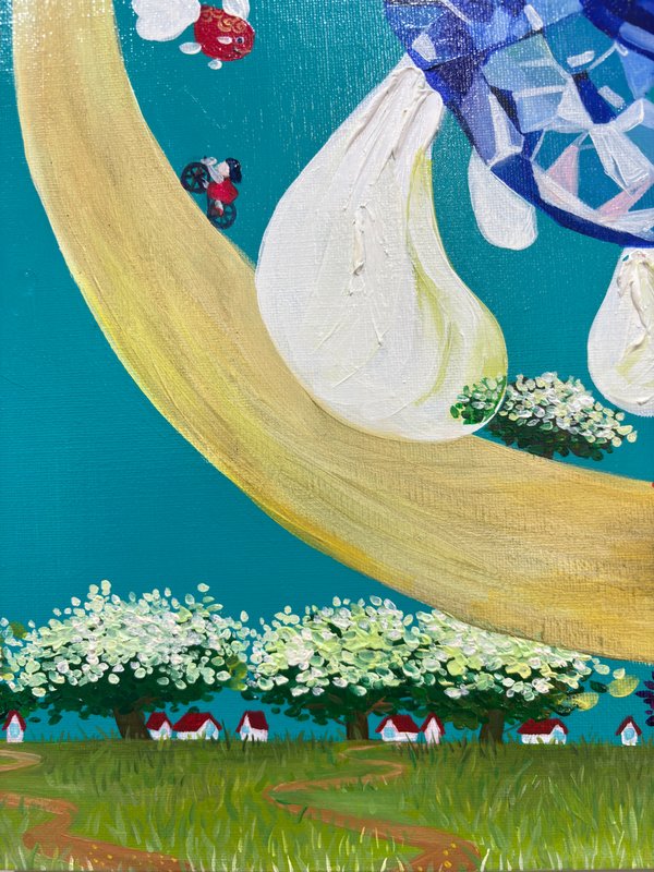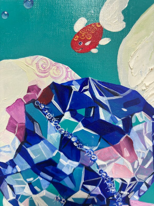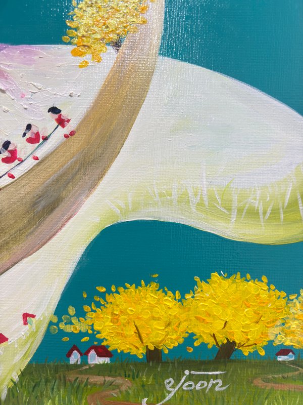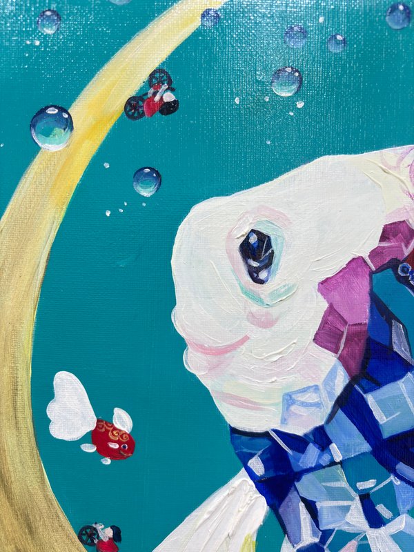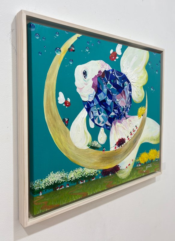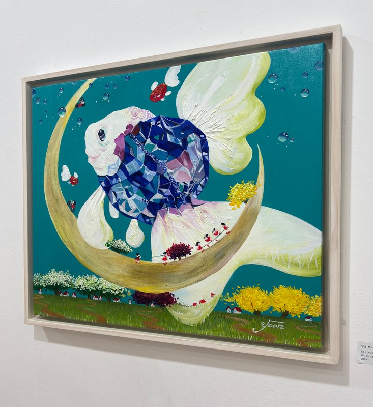강렬한 색감들로 채워진 꽃과 나무, 그리고 그 주변을 자유로이 헤엄치는 금붕어의 모습이 보입니다. 화려하게 표현된 꽃과 나무는 우리가 이루고 살아가는 사회를, 그리고 그 주변을 맴도는 금붕어는 사회와의 교감을 바라는 개인의 자아를 상징합니다. 사람은 늘 주변과의 소통을 바라고, 다양한 사회 안에서 소속감을 느끼길 바랍니다. 하지만 실제로는 스스로 소속되어 있는 사회 안에서도 사람은 외로움을 느끼는 경우가 많지요. 이는, 우리가 살아가며 겪고 행하는 소통이 대부분 피상적인 경우들이 많기 때문입니다. 그렇기에 계속해서 주변을 맴돌며 연결 지점을 탐색하는 물고기는 강한 색감과 화려한 자태를 지녔지만, 담담한 표정을 띠고 있는 것이 아닐까요? 이윤진 작가의 작품은 화사하고 아름다운 색감으로 공간을 환하게 밝혀주면서도, 진정한 공감과 소통에 대한 깊은 고찰을 이야기하고 있기에 의미 있는 선택이 되어줄 것입니다.