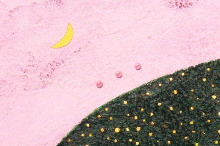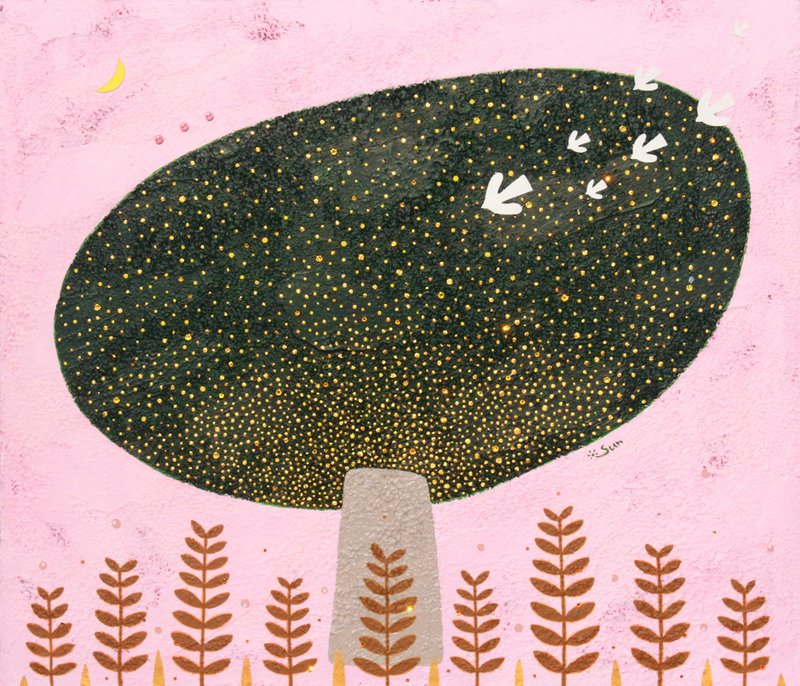 캔버스 안 가득 행복감과 동심이 느껴진다. 작가는 어린시절의 순수한 감성을 떠올리면서 느껴지는 세상을 표현한다. 아크릴로 그린 그림 위에 큐빅, 레이스, 패브릭 같은 작은 오브제들로 장식하면서 더욱 동화 같은 분위기를 연출한다. 어린아이가 느끼는 세상은 새롭고 신비로운 것들로 가득하다. 길가의 꽃, 나무, 하늘의 별, 날아가는 새 등 주변의 많은 것들로 하여금 매일매일 설렘을 느낄 수 있었다. 하지만 어른이 되어가며 그때의 감성은 서서히 흐릿해 진다. 그러나 작가는 우리가 언제든 그 때로 돌아갈 수 있다고 말한다. 시간은 빠르게 흘러가고 우리는 훌쩍 커버렸지만 어린시절 나를 설레게 했던 그것들은 여전히 곁에 남아있다. 잠시 어린시절을 회상해보며 그때의 감정을 느껴본다면 아름다운 이 세상에 계속 존재하고 있음에 감사함과 행복함을 느껴볼 수 있다.